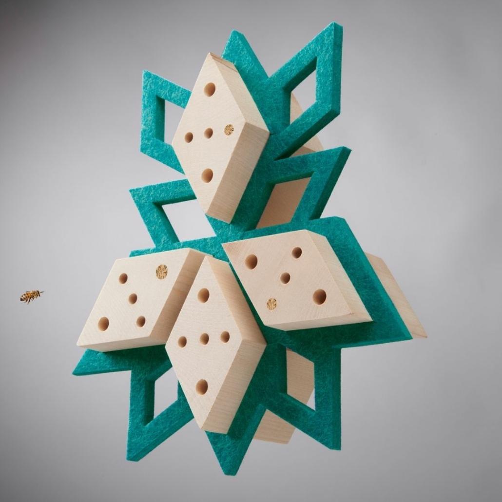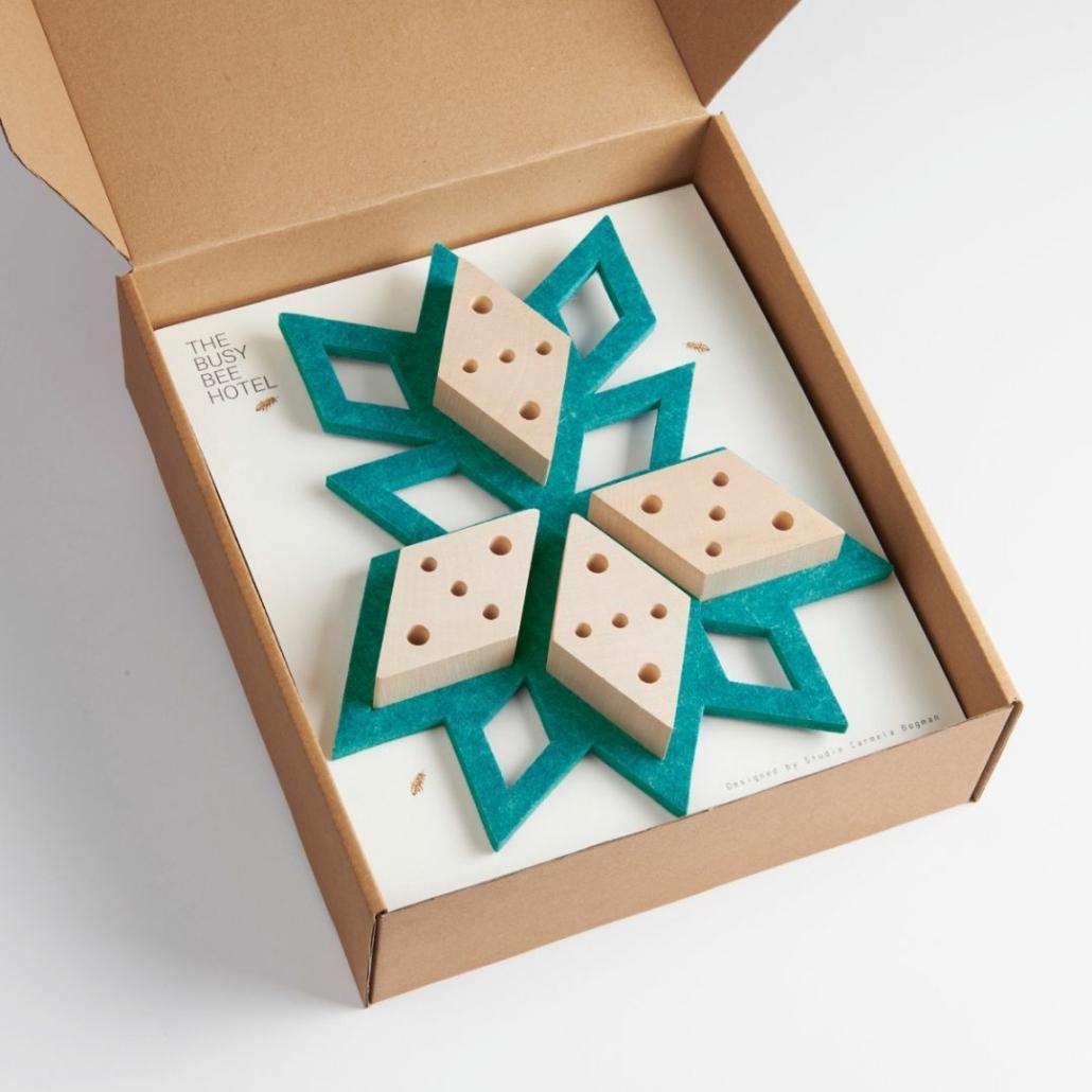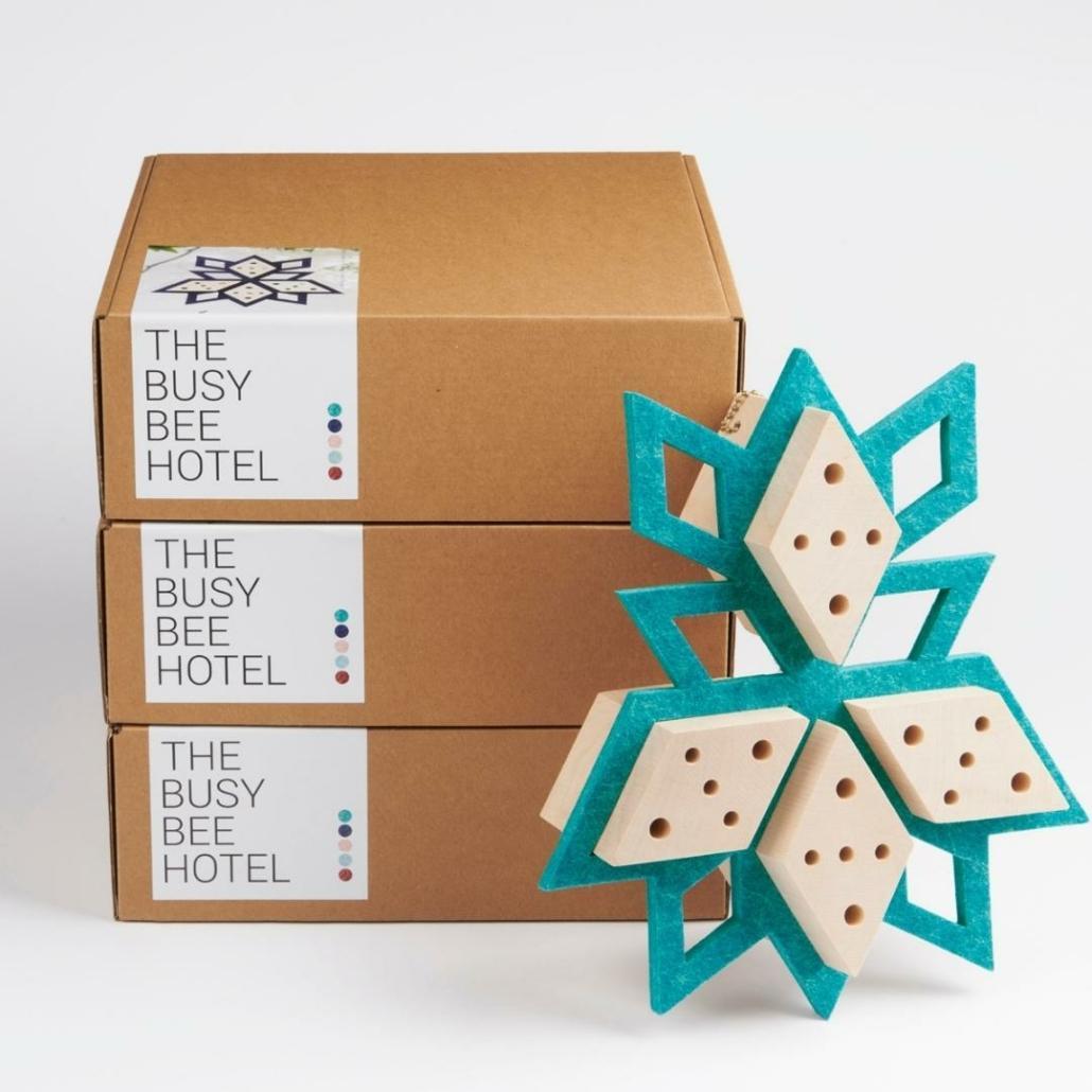 Dit originele bijenhotel ‘The Busy Bee Hotel’ is gemaakt van gerecycled waterproof vilt en esdoornhout. Het is ontworpen door Studio Carmela Bogman. Een cadeautje voor de design minnende bij en huis- en tuineigenaar.