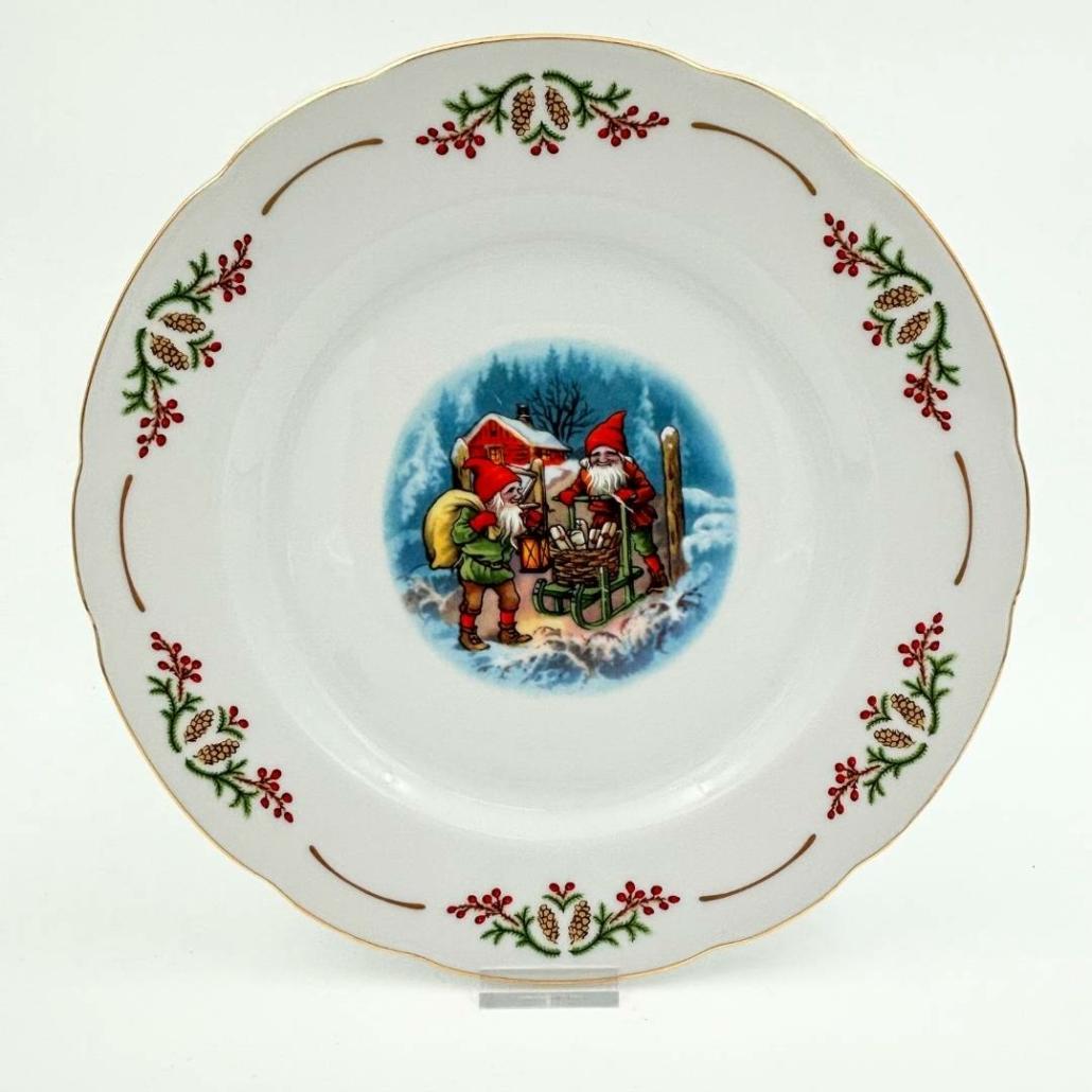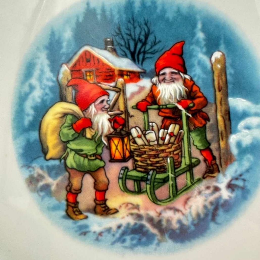 Het ultieme kerstservies uit Scandinavië. Dit grote bord heeft een prachtige tekening van kerstkabouters die cadeautjes rondbrengen op een slee, gemaakt door Lars Carlsson. Een klassiek romantisch kerstservies met een gouden randje en een band van kersttakken, dennenappels en rode besjes. De serie heet ‘Old Fashioned Christmas’ door Christineholm voor Firkloveren.