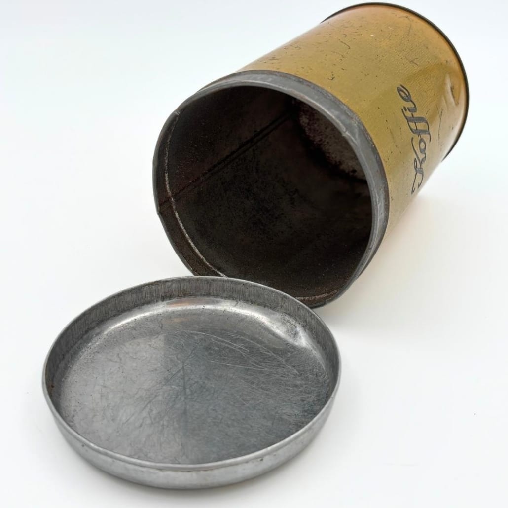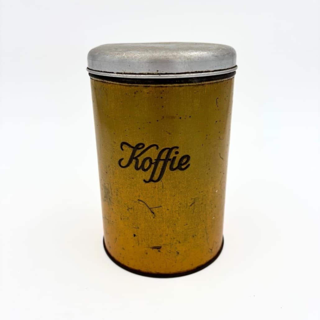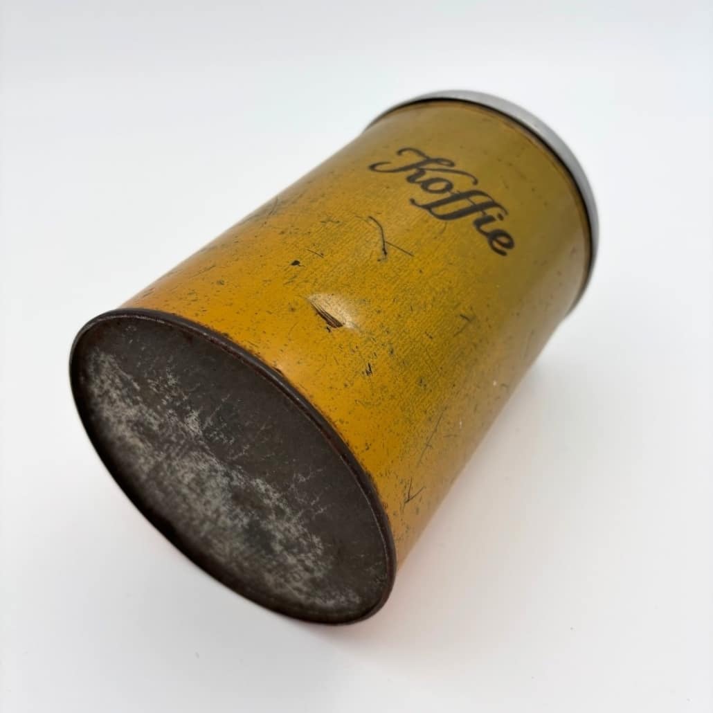 Dit leuke oude koffieblik heeft een mooie okergele kleur. Het sleetse karakter geeft het blik een fijne brocante sfeer. Een toevoeging aan je landelijk keuken.