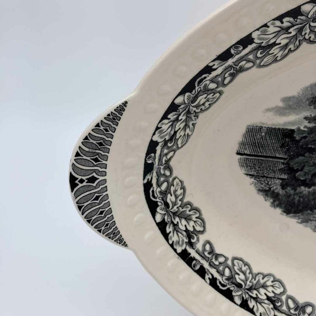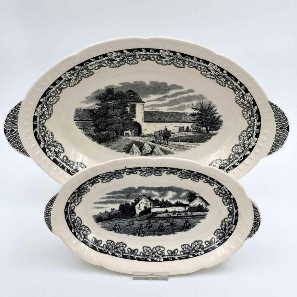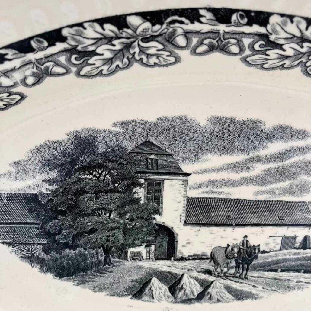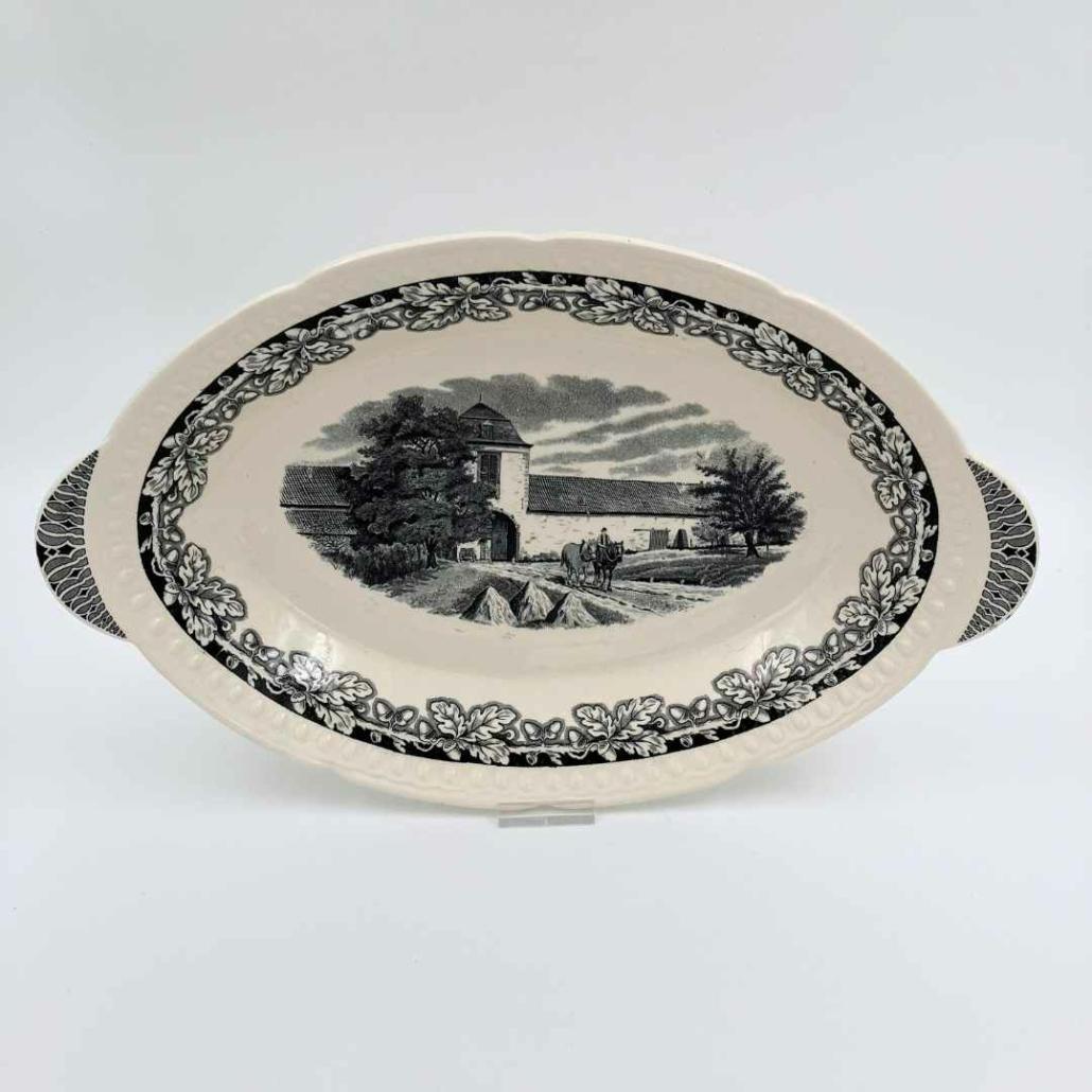 Grote broodschaal of serveerschaal Société Céramique Maestricht Boerenhoeve, de zwarte editie. Dit decor werd gemaakt tussen 1930 en 1958 in de kleuren zwart, blauw, rood en ingekleurd. De boerenhoeves die zijn afgebeeld zijn oorspronkelijk te vinden in Zuid-Limburg. In mooie gebruikte conditie.