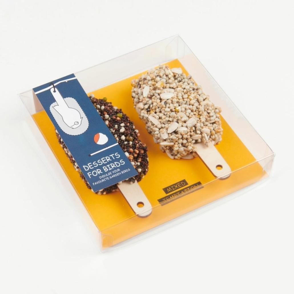 Leuke verrassing: nadat de vogels het toetje met smaak hebben verorberd, komt er een origineel lasergesneden ijsstokje tevoorschijn, in de vorm van een roodborstje, een koolmeesje of een halsbandparkietje.