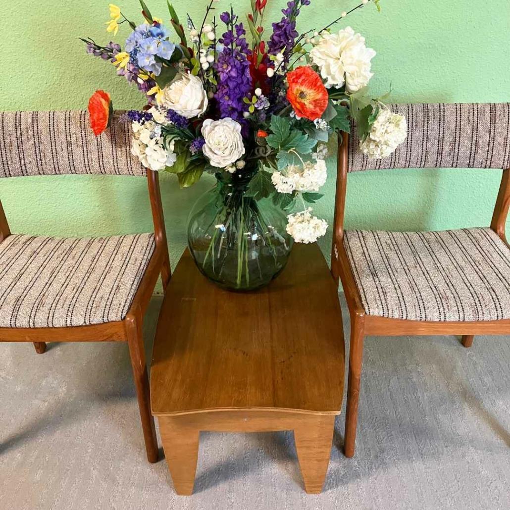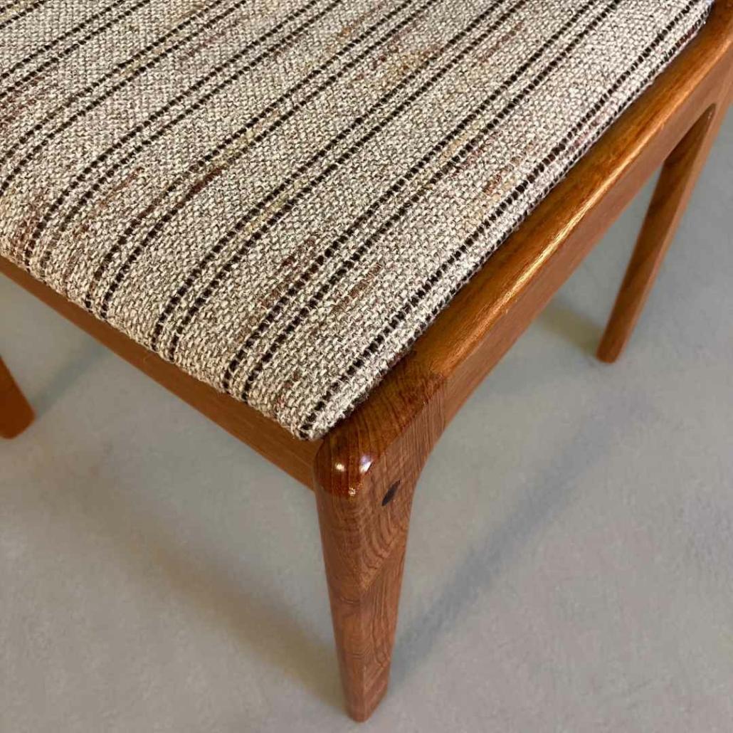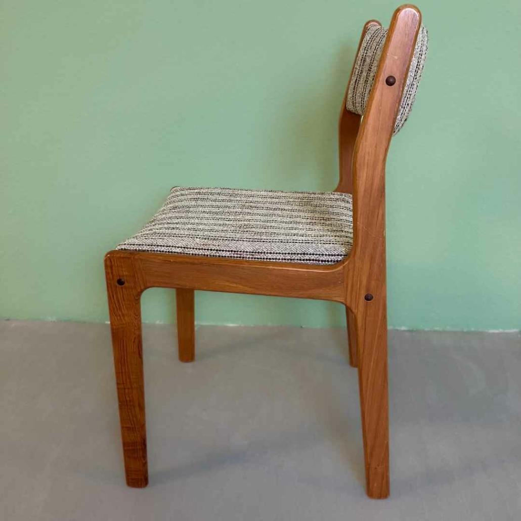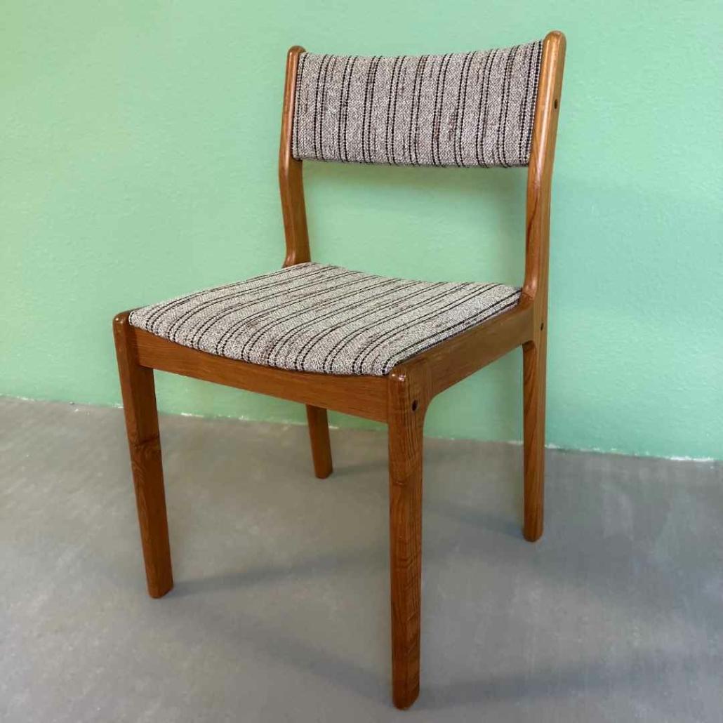 Prachtige en degelijke vintage eetkamer stoel van Deense makelij. Het hout heeft mooie verbindingen en de rugleuning maakt een subtiele knik naar achteren wat de stoel een fraaie lijn geeft. De warme bekleding is perfecte conditie.