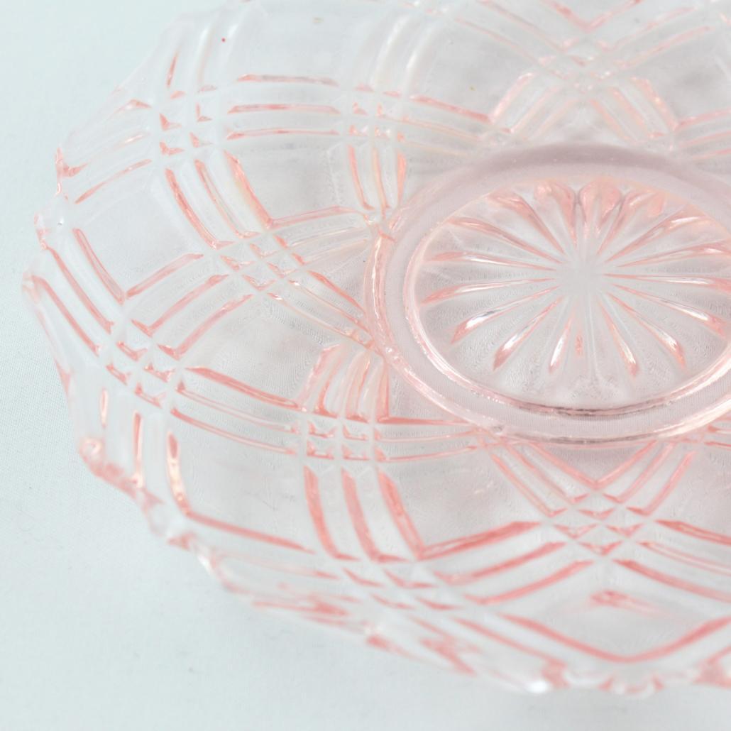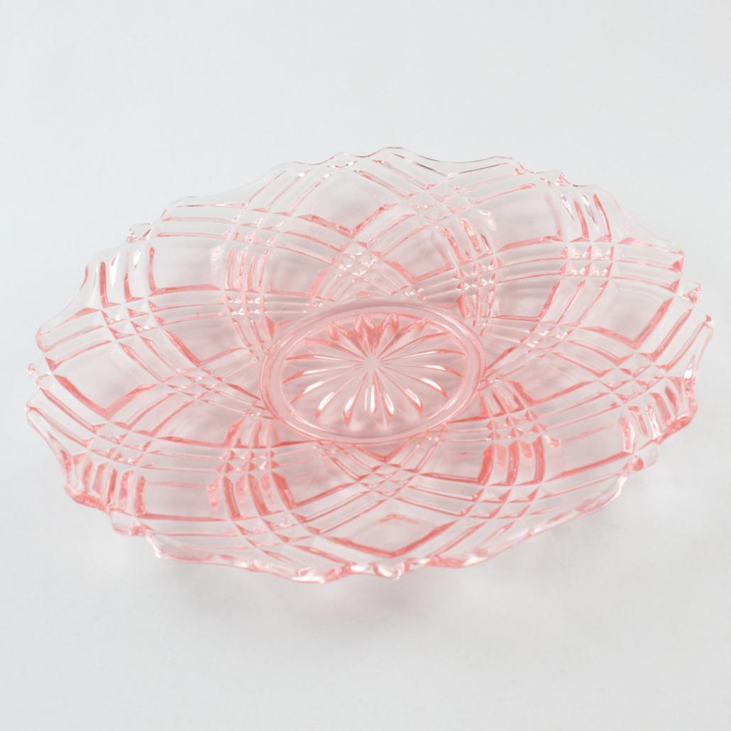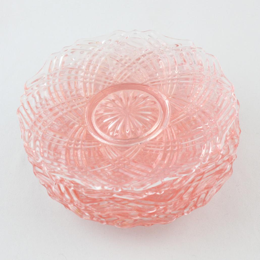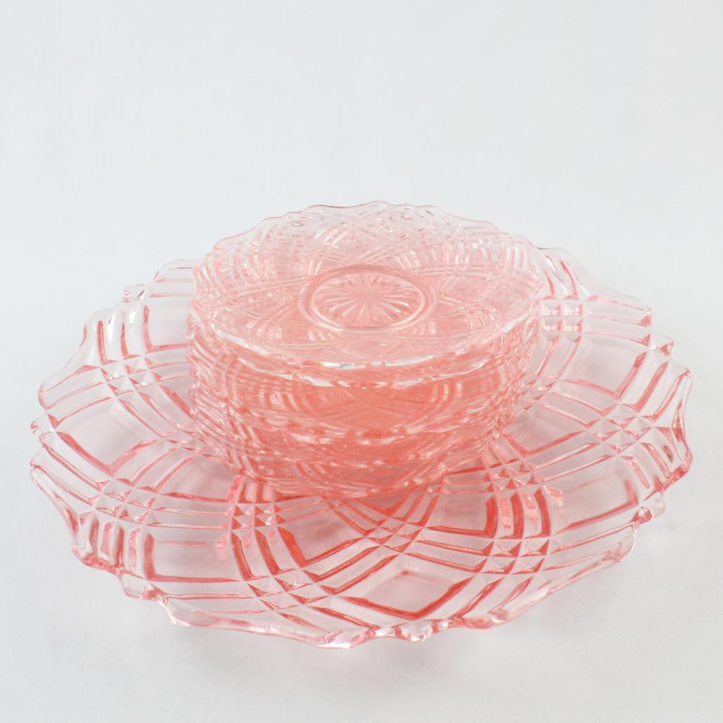 Taartschaal met zes kleine schaaltjes van prachtig roze geperst glas uit de jaren ’50.