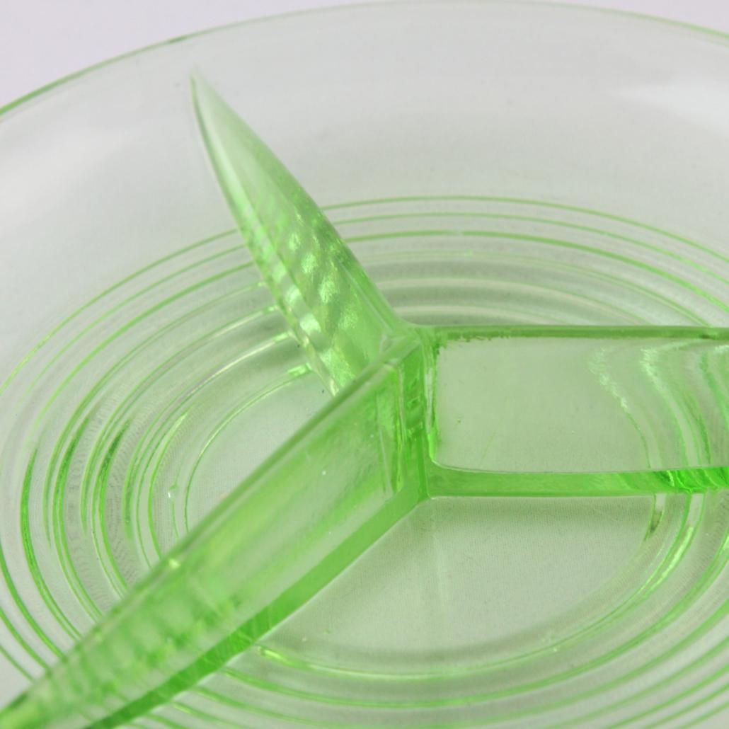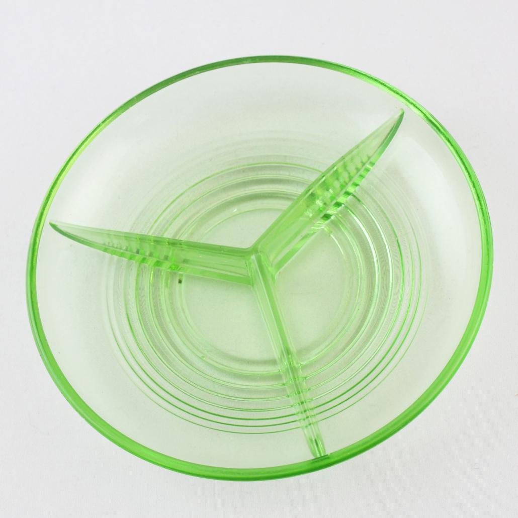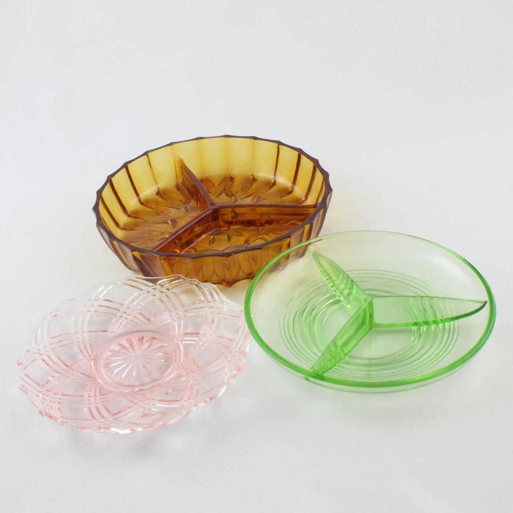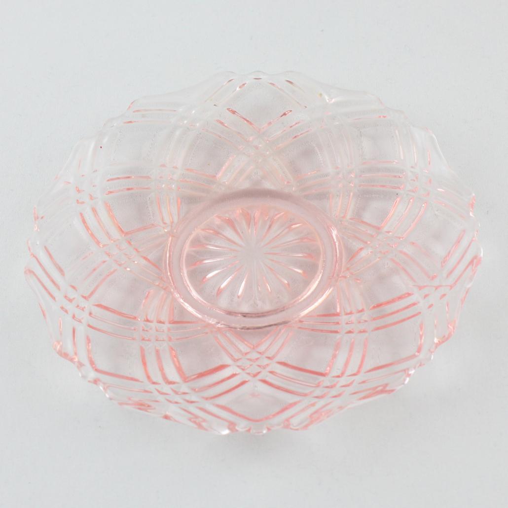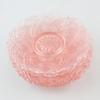 Taartschaal met zes kleine schaaltjes van prachtig roze geperst glas uit de jaren ’50.