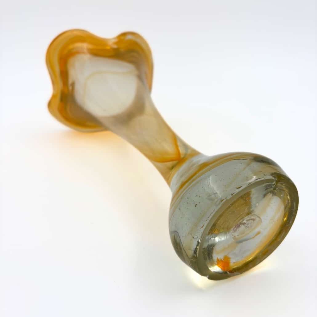 Naar deze handgeblazen glazen vaas blijf je kijken door de slingers van kleur in de prachtige kelk en de bodem. De oranje swirl draait in een melkachtige ondertoon en eindigt in grijs in de bodem van de vaas.