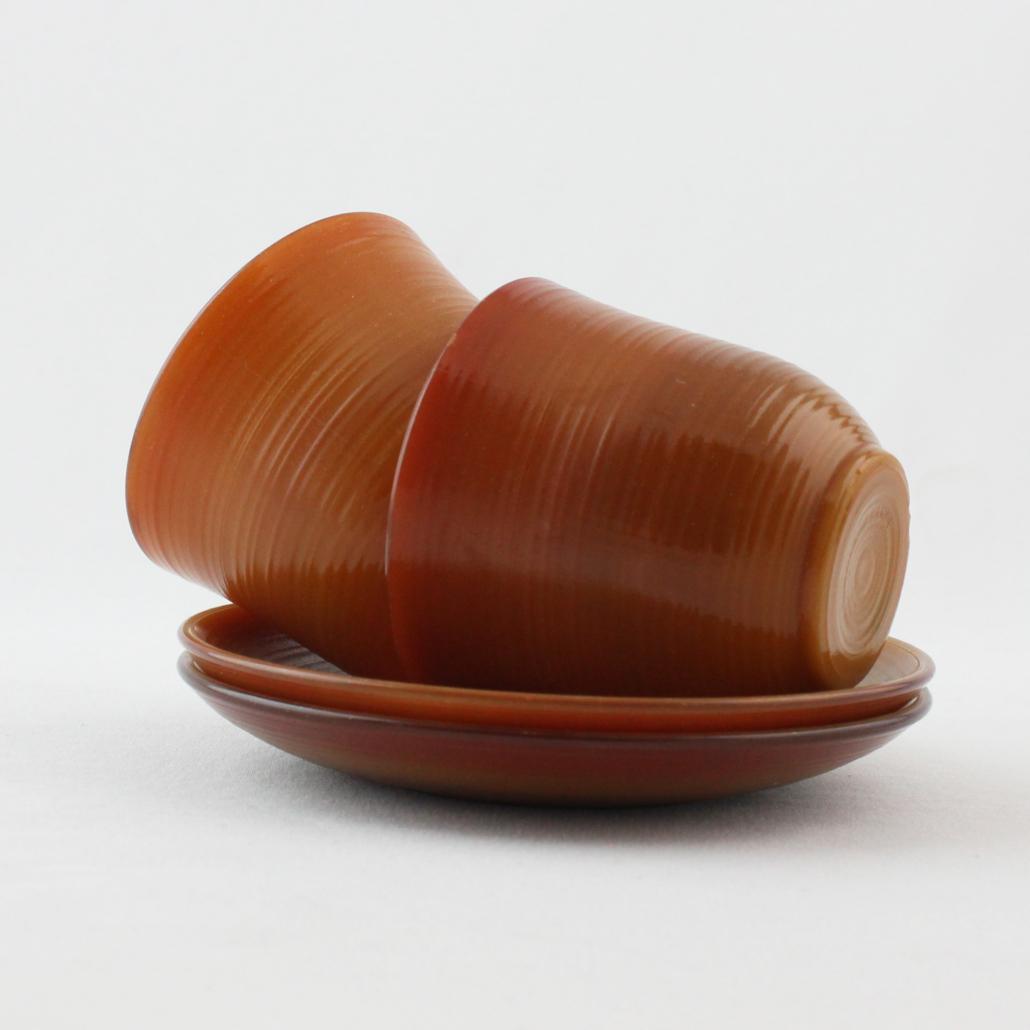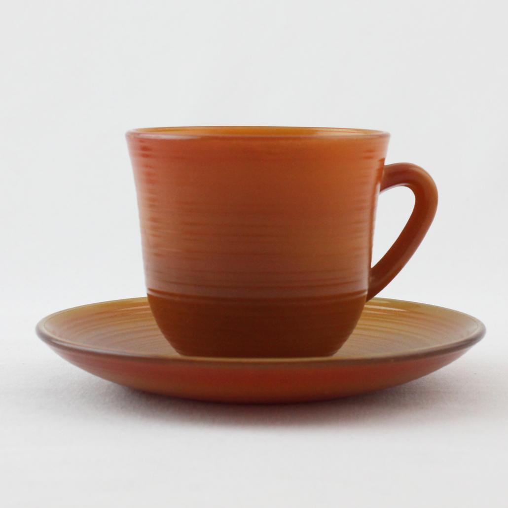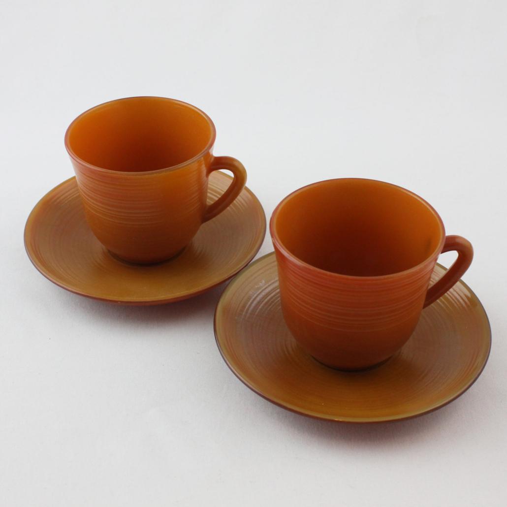 Bijzonder setje kop en schotels van Arcopal France. Dit type amberkleurig melkglas ben ik nog niet eerder tegengekomen. Het is half doorschijnend en heeft mooie lijnen in het glas. In prachtige vintage staat.