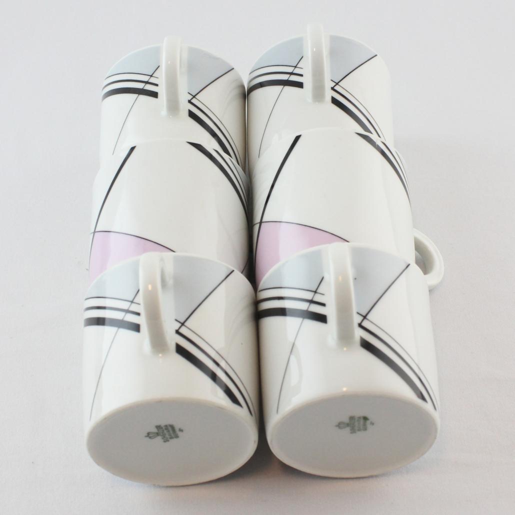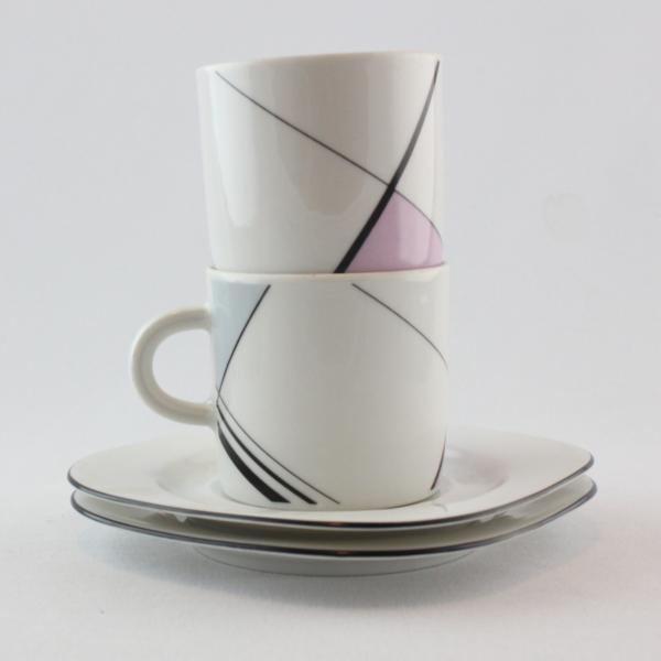 6 leuke kop en schotels met jaren ´80 design van Scherzer uit Bavaria Germany. Grijs en roze.