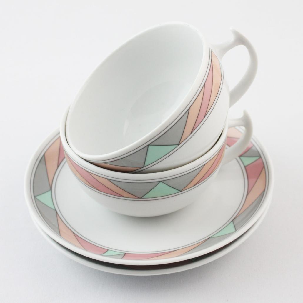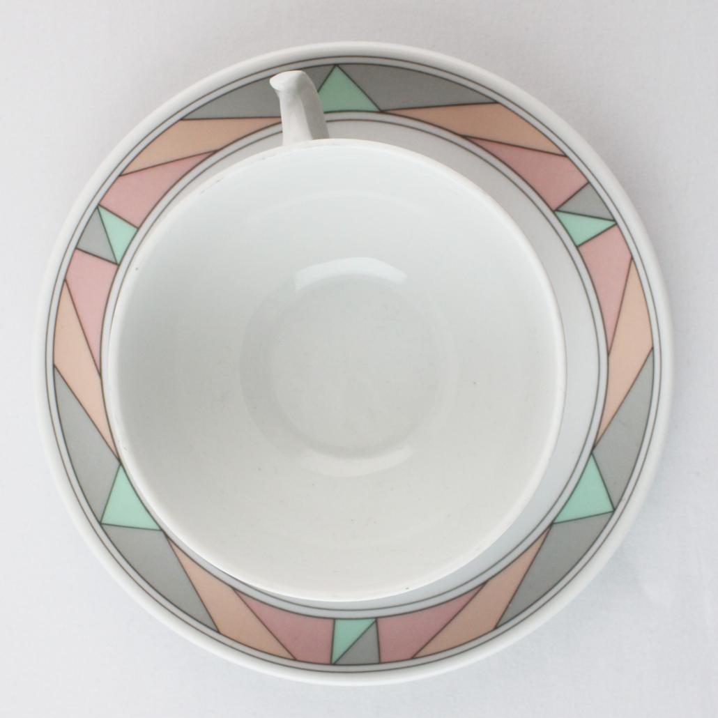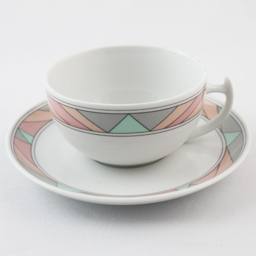 Geinige jaren ´8o style theekop en schotel van Seltmann Weiden in Bavaria, Duitsland. Leuk te combineren met ander jaren ´80 servies in roze, grijs of mint groen. In prachtige vintage conditie.