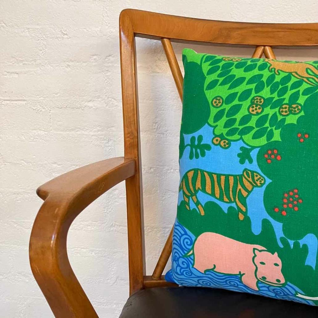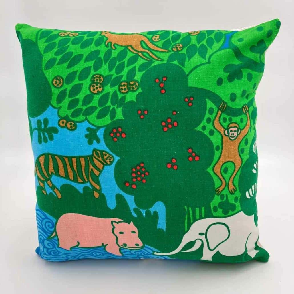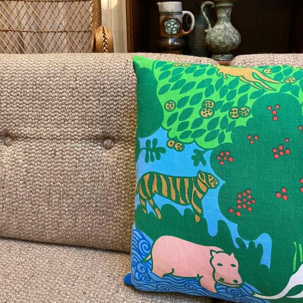 Vrolijk kussen van een vintage stof van de Zweedse vormgever Anna-Lena Emdén. De stof heet Adam en Eva. De achterkant van het kussen is gemaakt van een beige stof met een lichte glans.