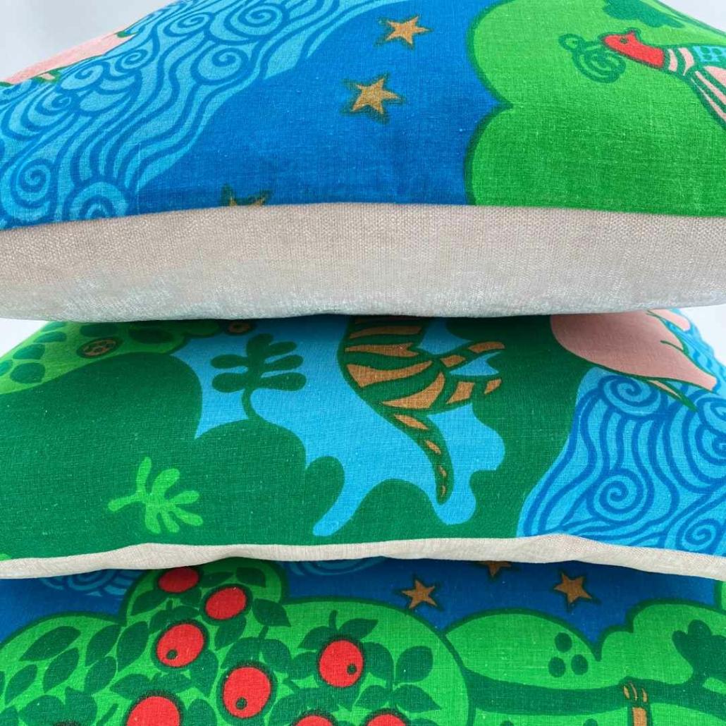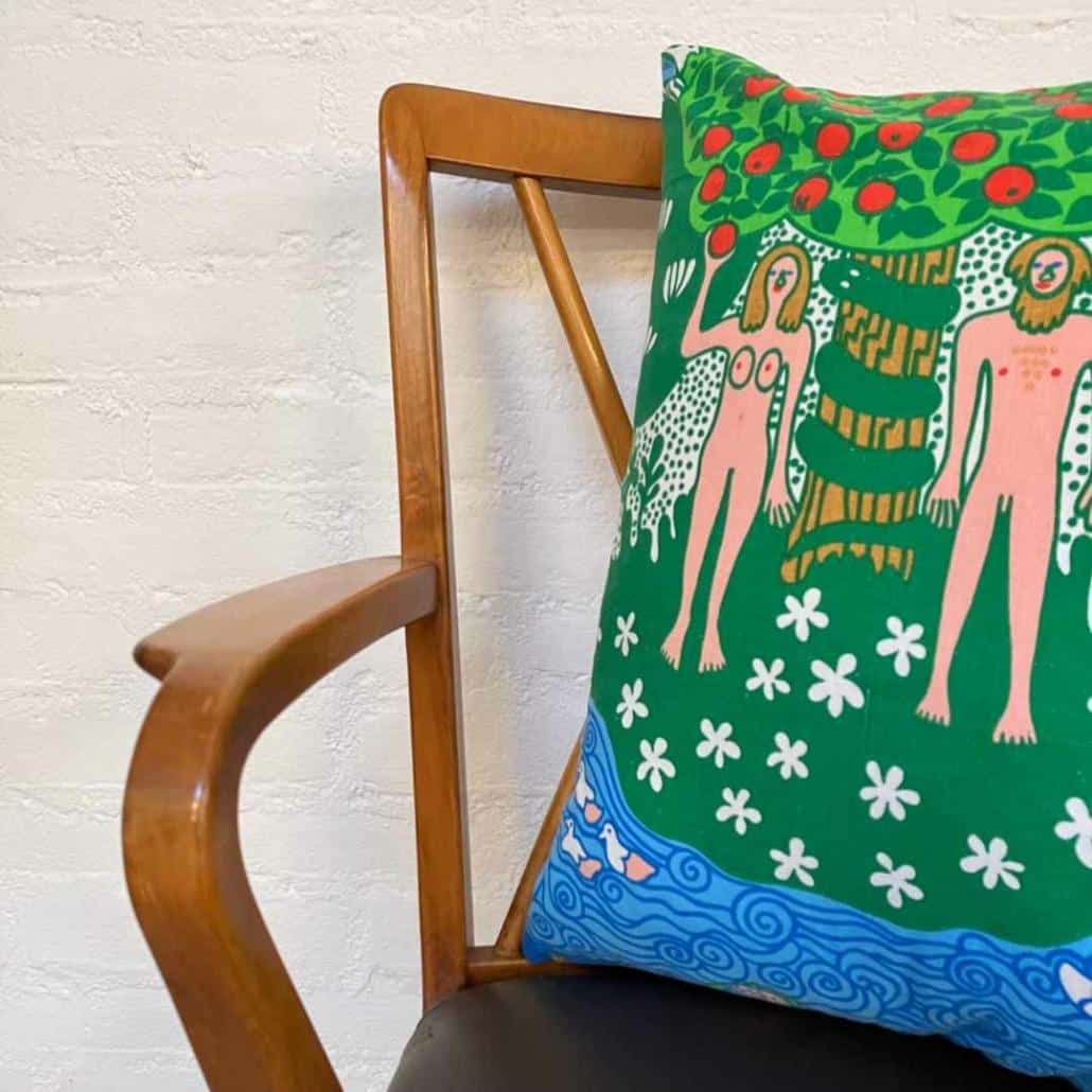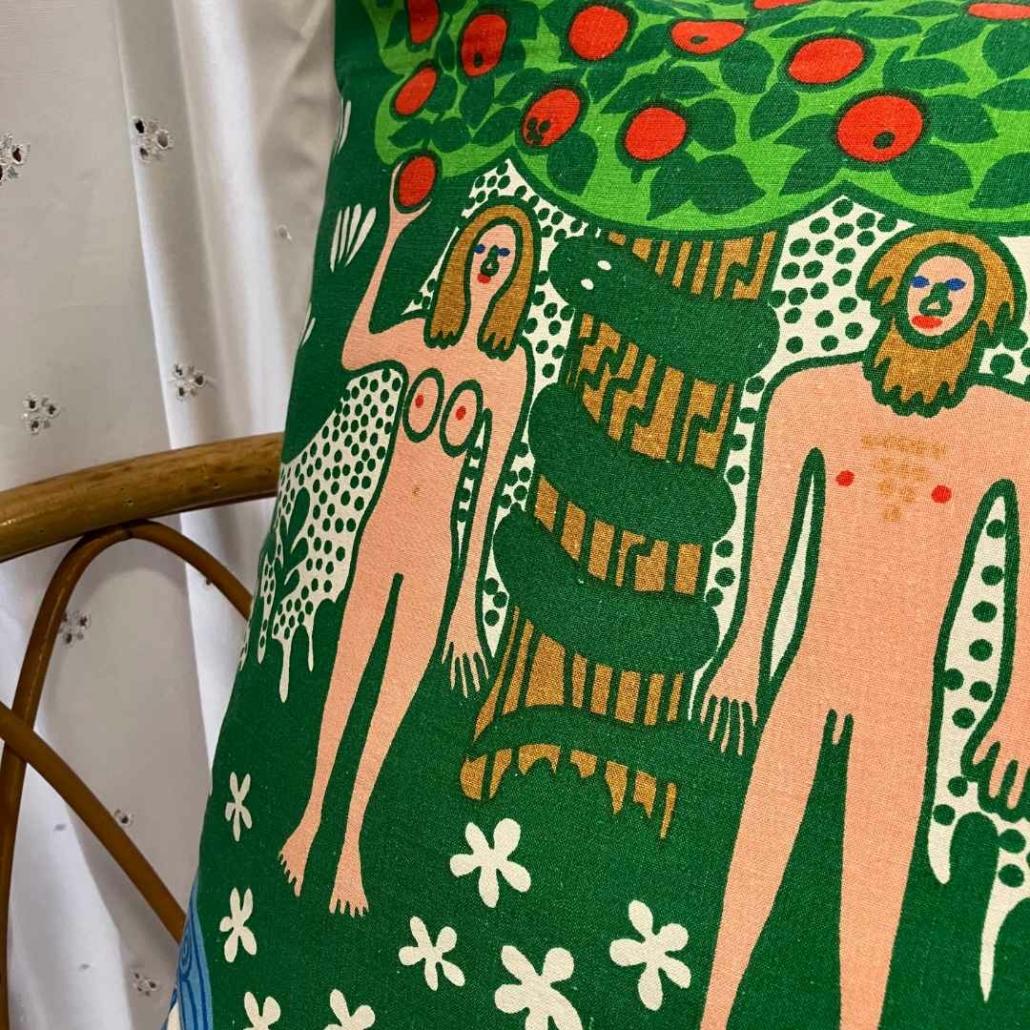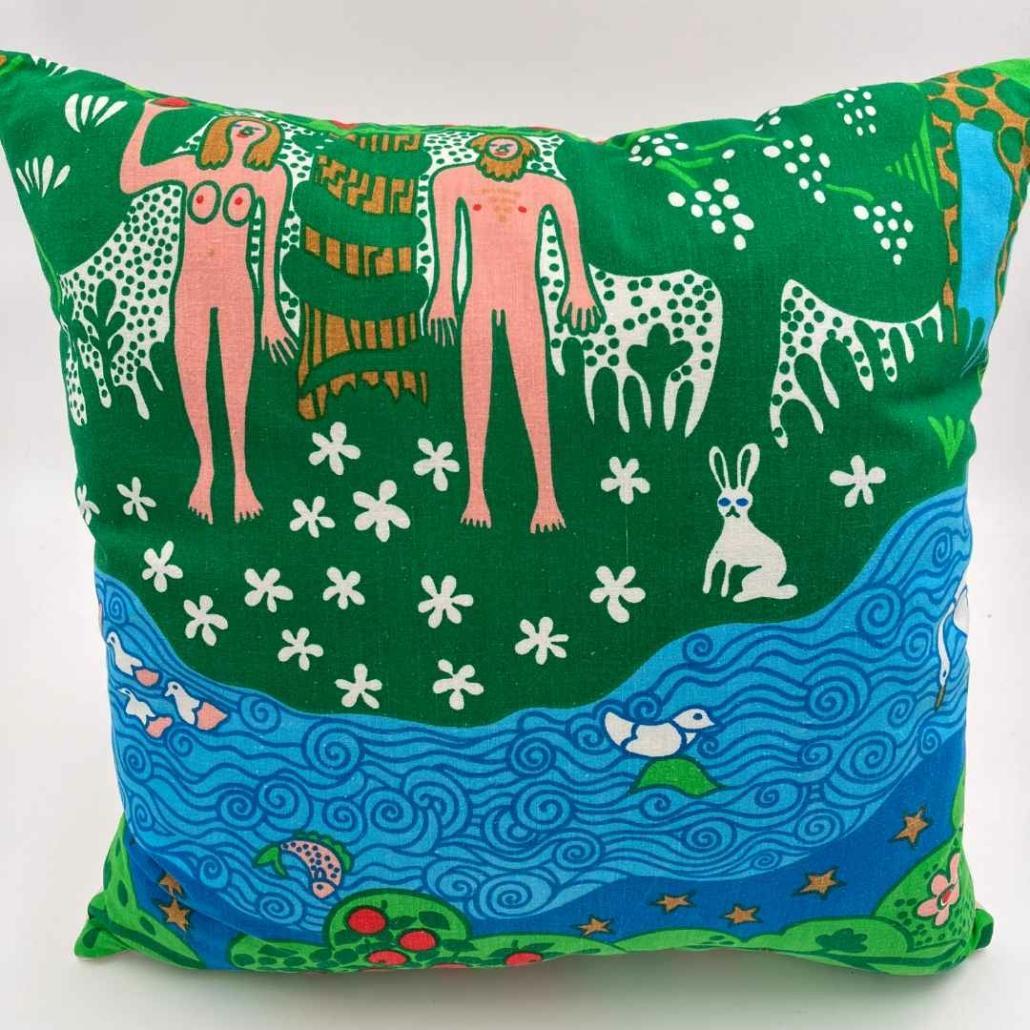 Vrolijk kussen van een vintage stof van de Zweedse vormgever Anna-Lena Emdén. De stof heet Adam en Eva. De achterkant van het kussen is gemaakt van een beige stof met een lichte glans.