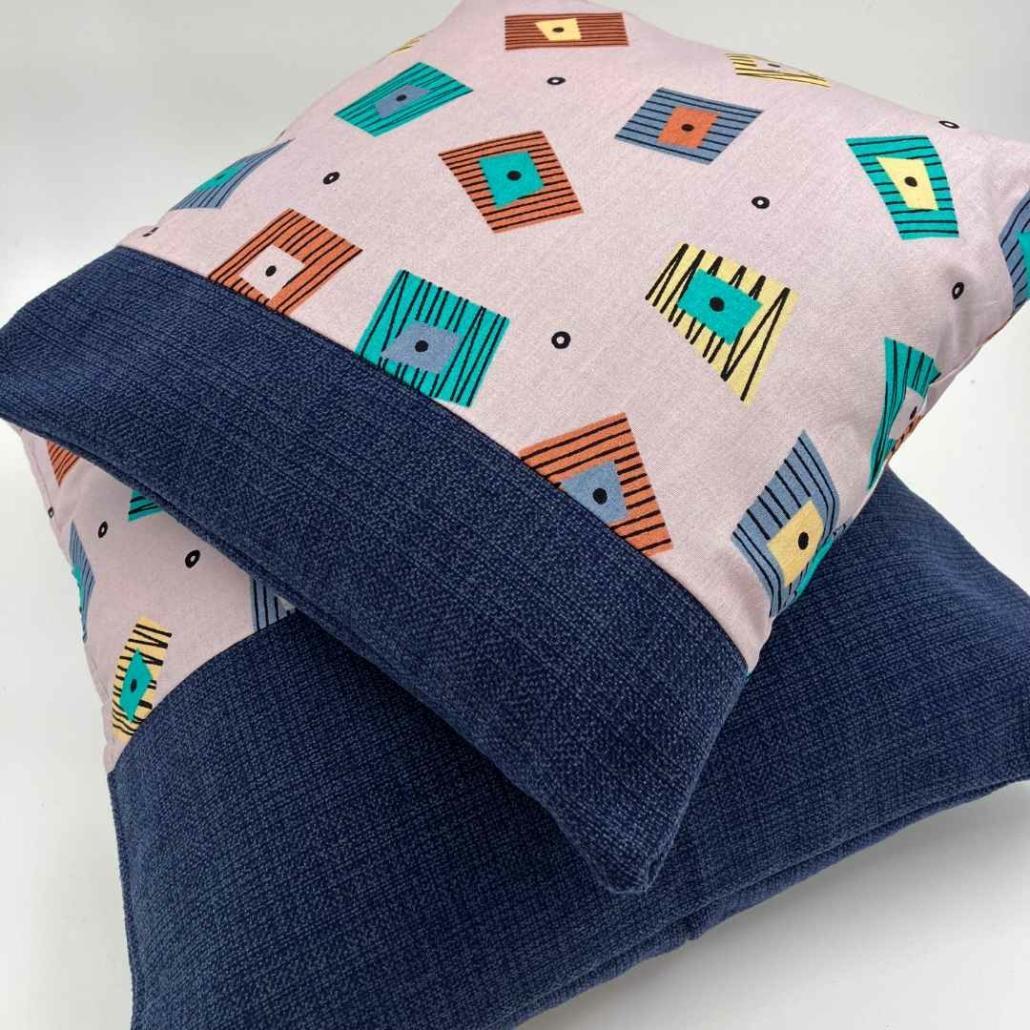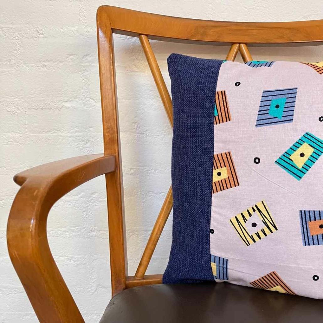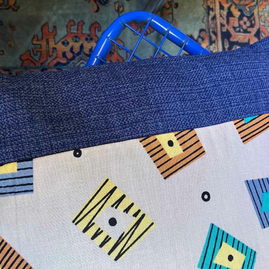 Prachtig kussen met geometrisch patroon ontworpen door Synnove Mork voor IKEA in de jaren ’90. Met een mooie donkerblauwe band. Dit handgemaakte kussen is gemaakt van vintage -en reststoffen. Het is onderdeel van de collectie Dåtid, een samenwerking tussen Warenhuis Strant en Barabrenda, waarbij we kussens samenstellen en maken met vintage stof, oude Zweedse bloemetjesgordijnen, fleurige tafelkleedjes en designstoffen. Ieder kussen is uniek en duurzaam geproduceerd.