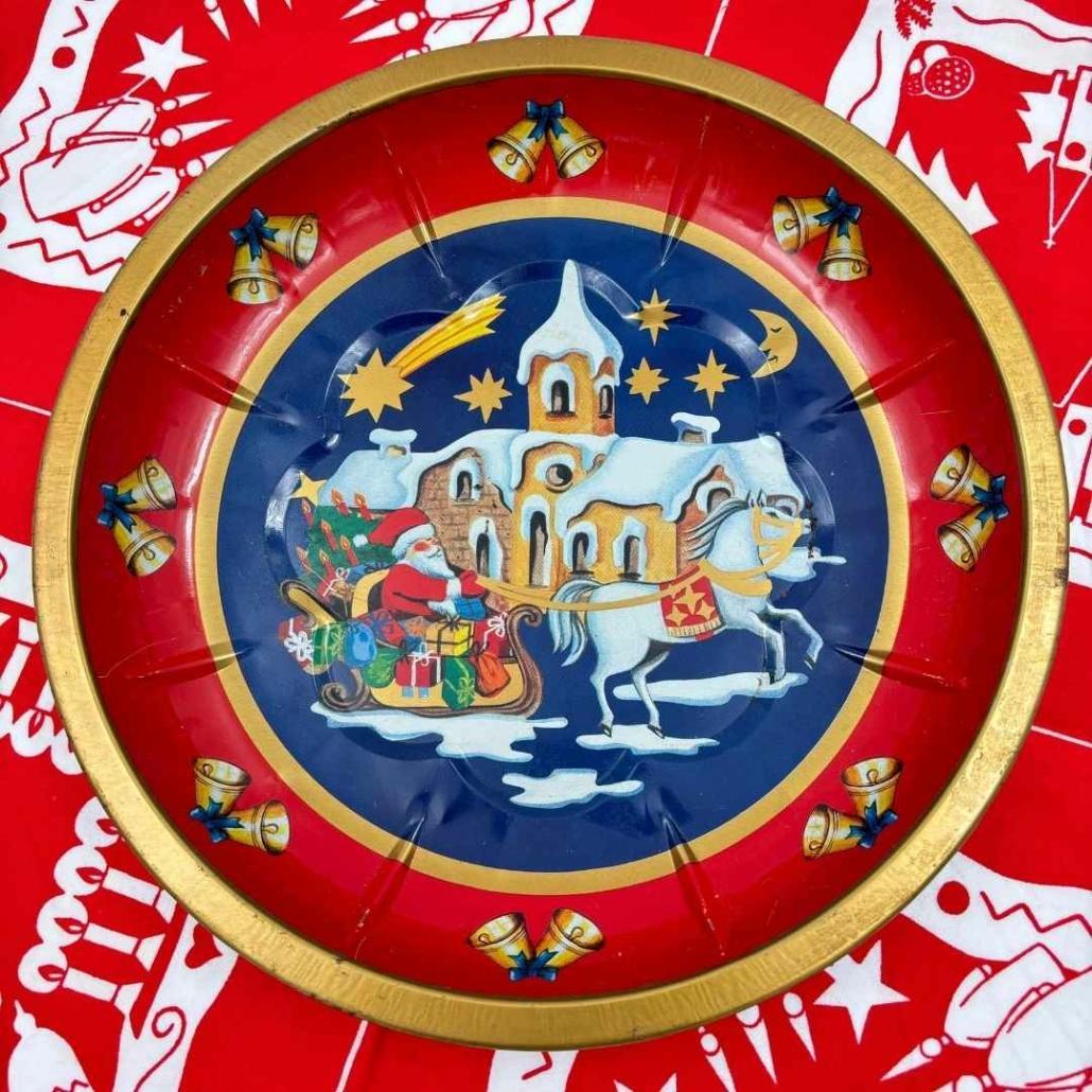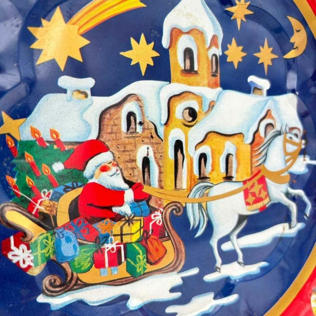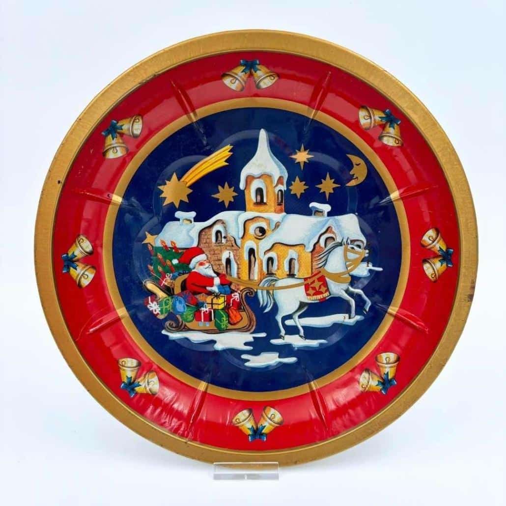 Dit kerstbord van licht metaal heeft een heerlijke nostalgische afbeelding van de kerstman op zijn slee vol cadeautjes. Door de sneeuw glijdt hij door de kerstnacht. Leuk voor op tafel met kaarsjes of vol lekkere kerstsnoepjes.