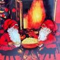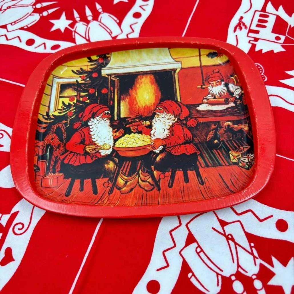 Dit serveerschaaltje van licht metaal heeft een heerlijke nostalgische afbeelding van twee kerstkabouters voor de open haard. Ze eten rijstepap. De kerstkabouter, tomte of nisse is Scandinavische folklore. In de volksverhalen komt hij voor als een beschermgeest op boerderijen. In de kersttijd zetten de bewoners rijstepap buiten voor de kerstkabouter om hem te bedanken.