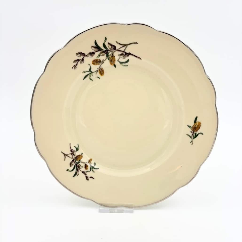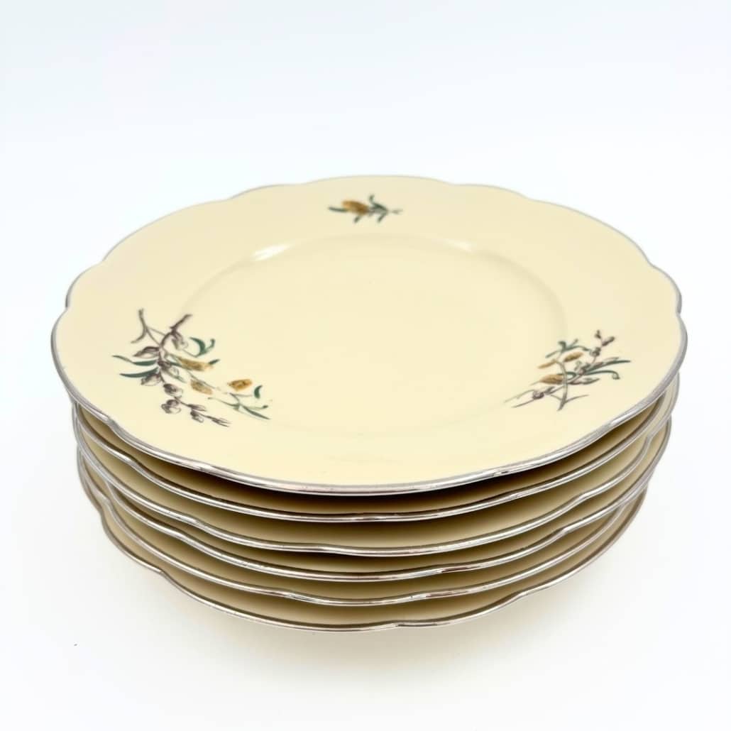 Deze elegante vintage ontbijtborden hebben een warme, crèmekleurige basis met een verfijnde, golvende rand die subtiel is afgewerkt met een zilverkleurig accent. Ze zijn gemaakt in de porseleinfabriek van Kongens Ljunby in Denemarken.