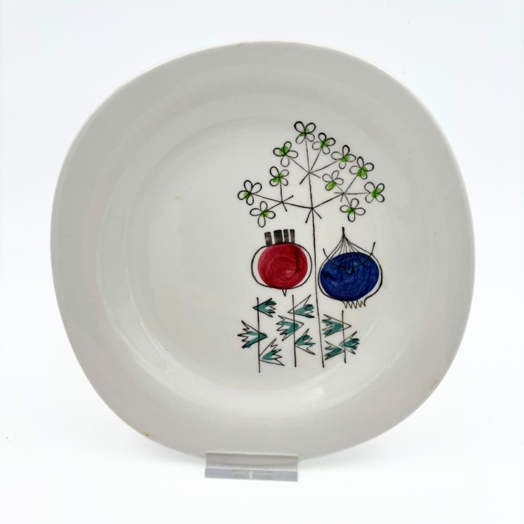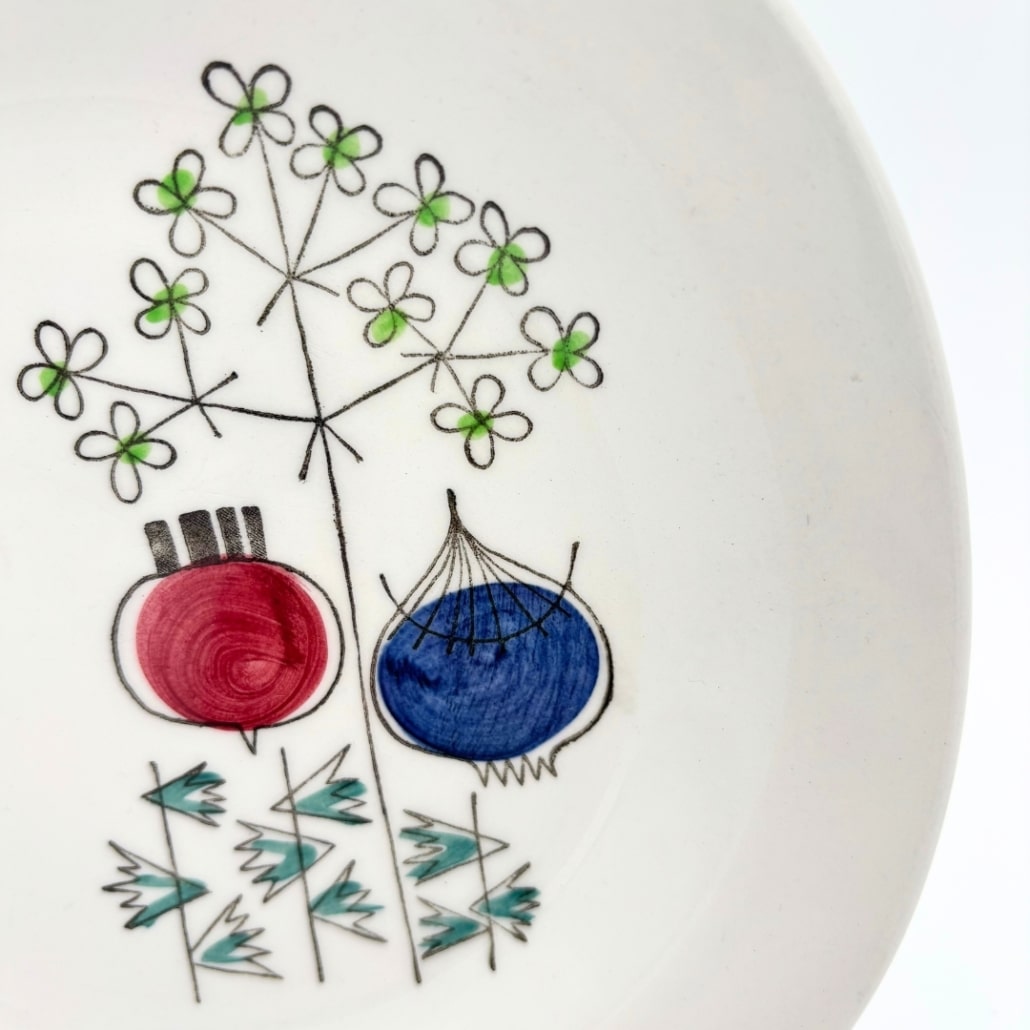 Het Pomona motief is een voorbeeld van de vrolijke, organische en praktische stijl waar Marianne Westman beroemd mee werd in de jaren ’50. Het werd geproduceerd door Rörstrand tussen 1956 en 1971.