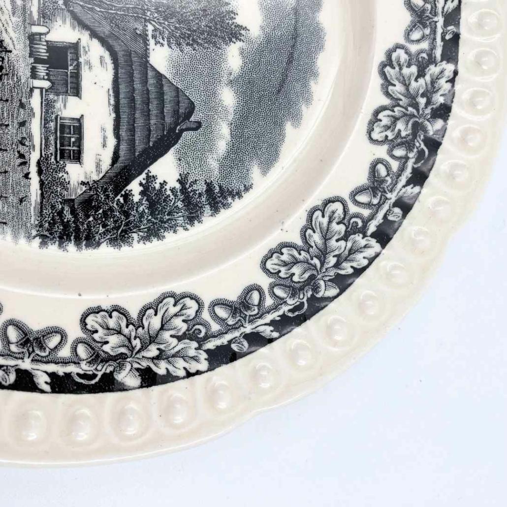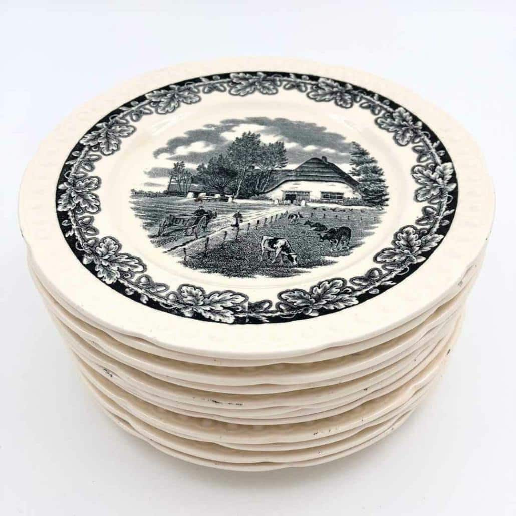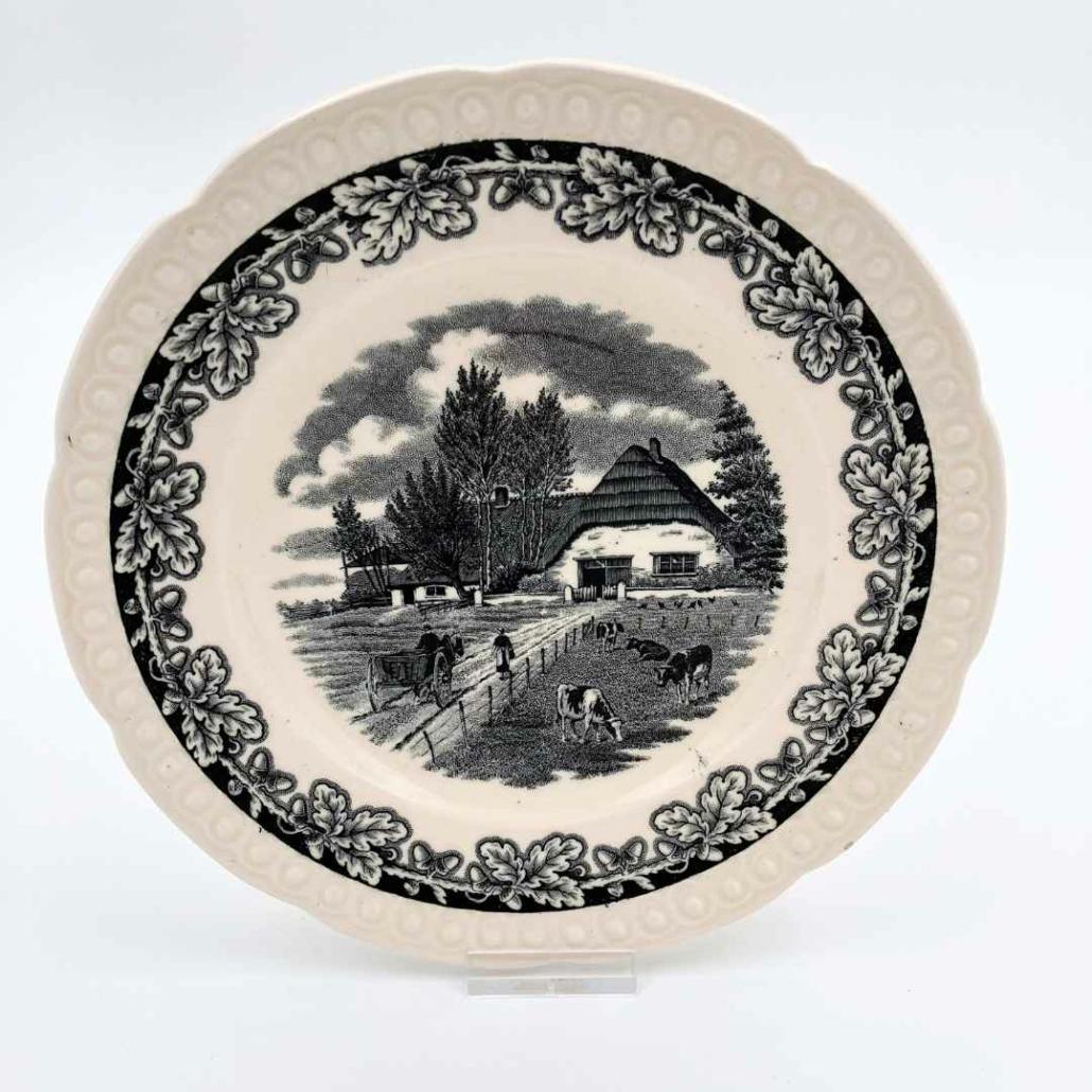 Ontbijtborden van Société Céramique Maestricht Boerenhoeve, de zwarte editie. Dit decor werd gemaakt tussen 1930 en 1958 in de kleuren zwart, blauw, rood en ingekleurd. De boerenhoeves die zijn afgebeeld zijn oorspronkelijk te vinden in Zuid-Limburg. In mooie gebruikte conditie.
