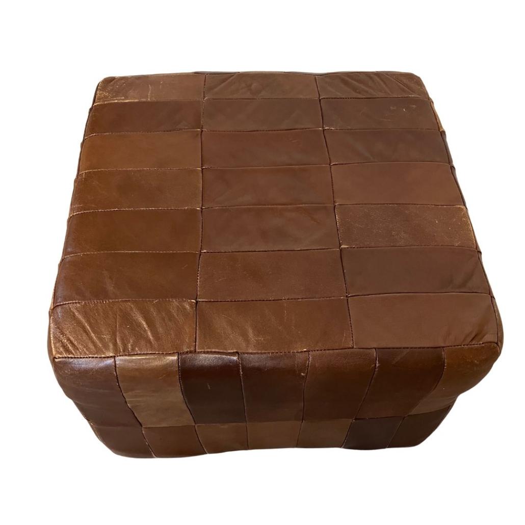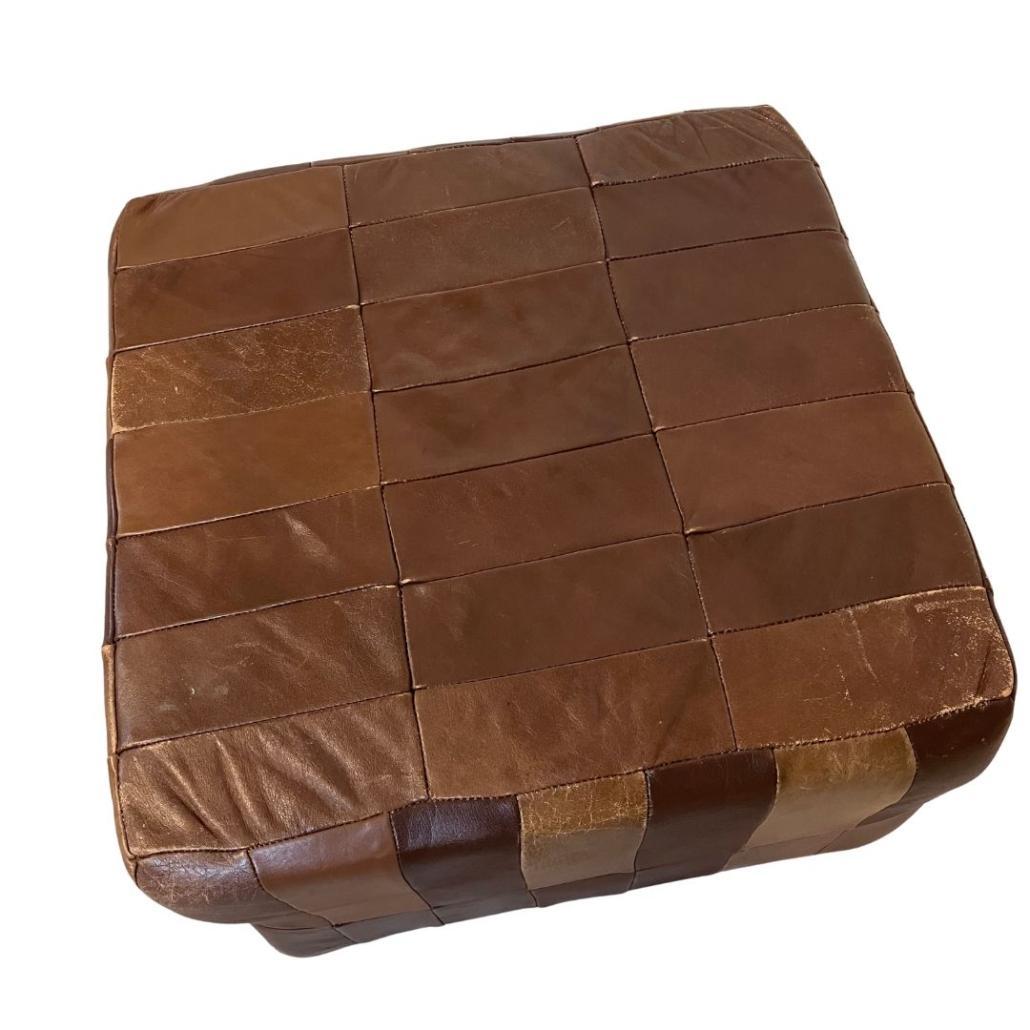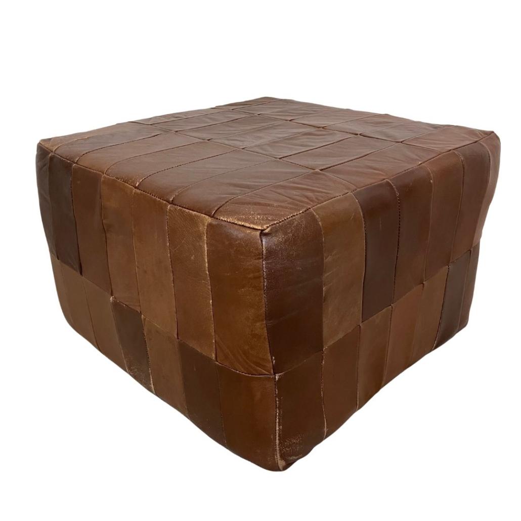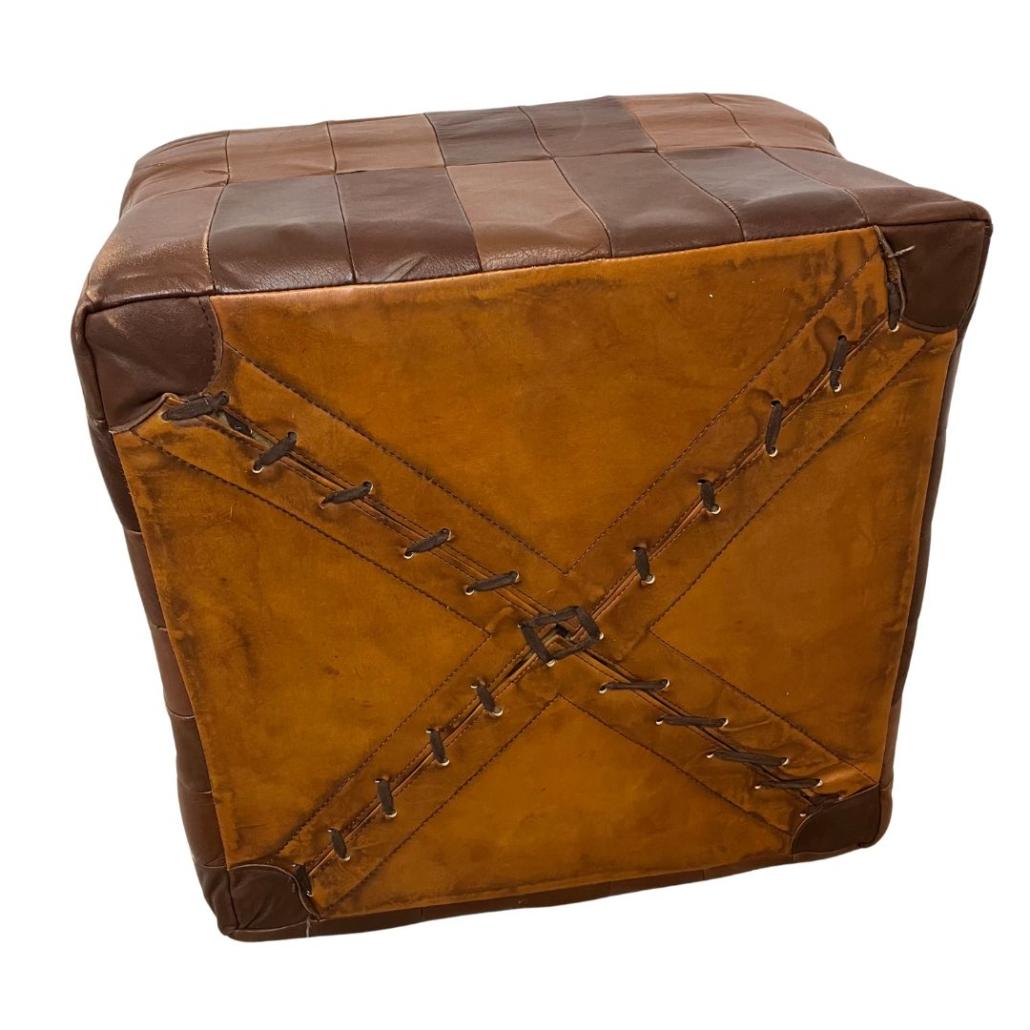 Leuke vintage patchwork poef van leer. Helemaal in de jaren ’70 stijl. Zit heerlijk stevig. Ook leuk met een dienblad erop als bijzettafel.