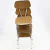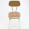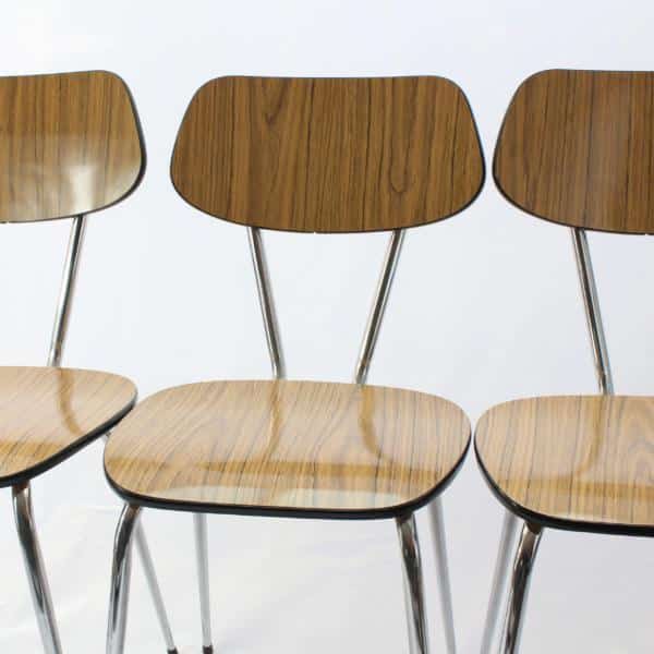 Drie mooie retro formica stoelen met bruine houtstructuur.