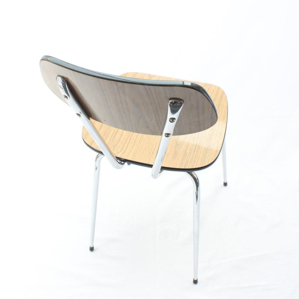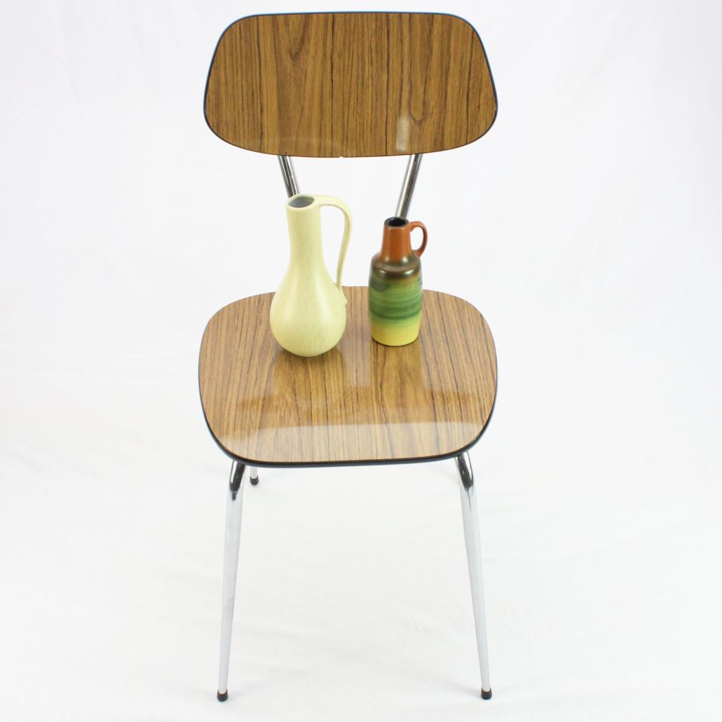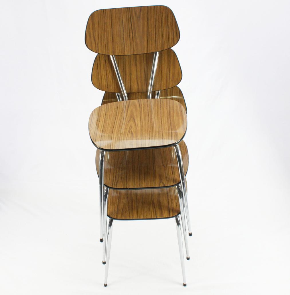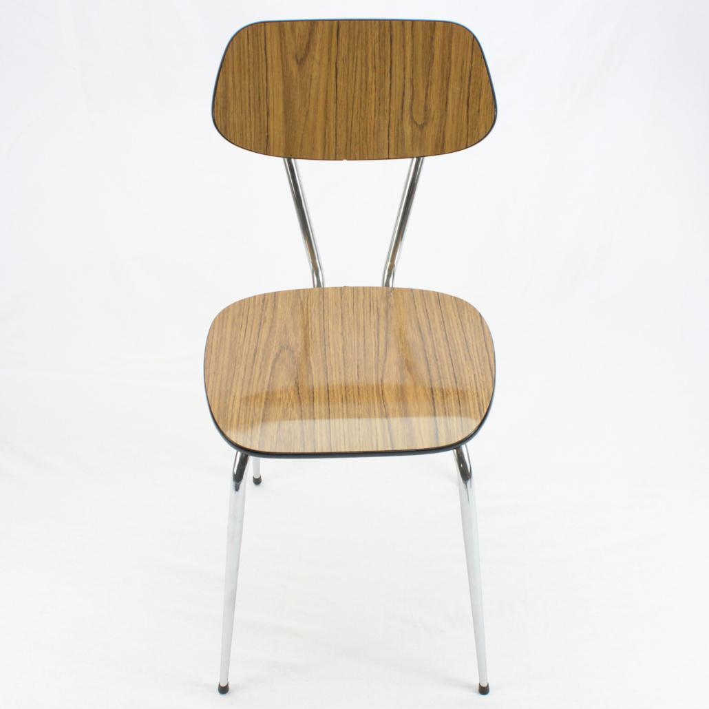 Drie mooie retro formica stoelen met bruine houtstructuur.