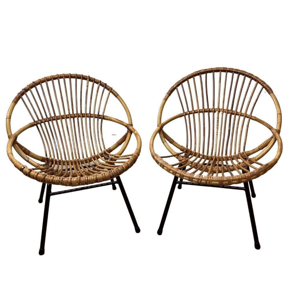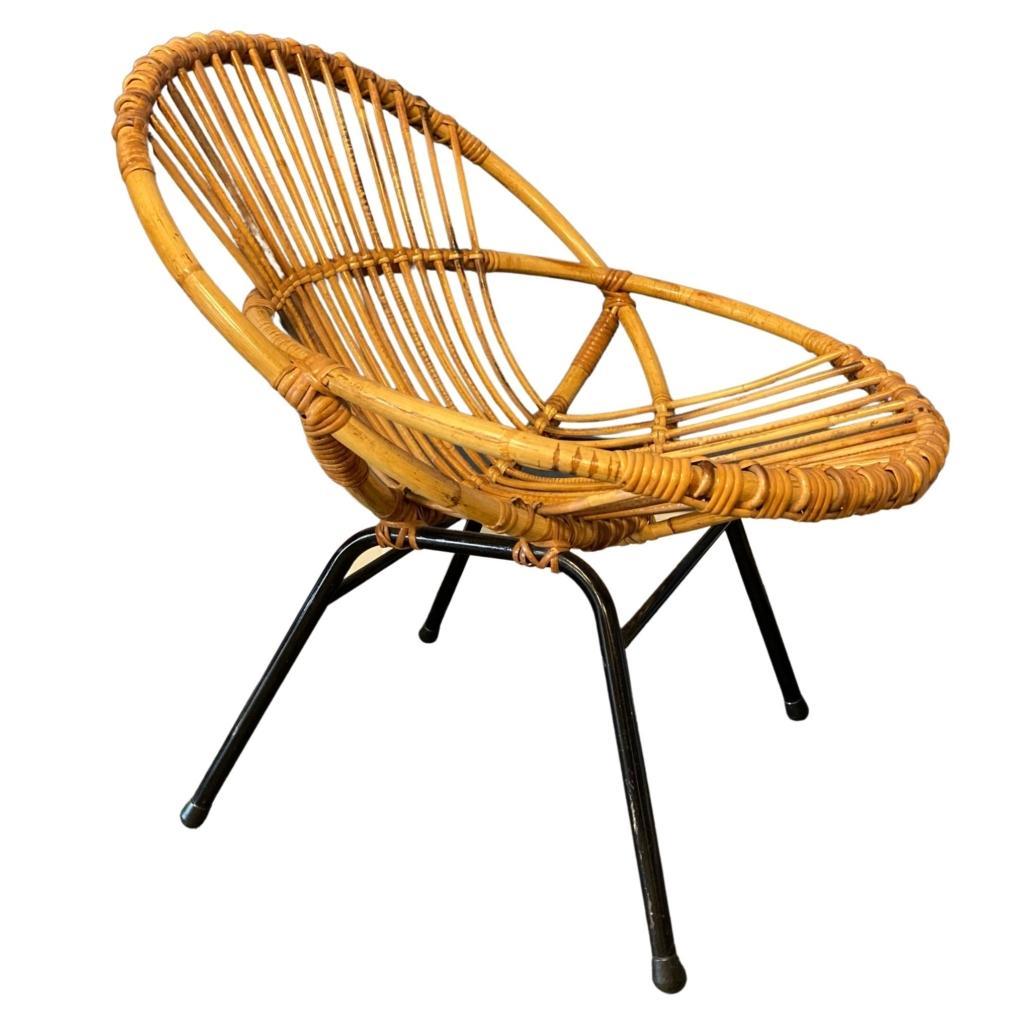 Een vintage klassieker: de kuipstoel van Rohé Noordwolde. Rotan met zwarte ijzeren pootjes. Het rotan is in goede vintage conditie. Geen kapotte delen. De zwarte stalen poten hebben hier en daar beschadigingen.