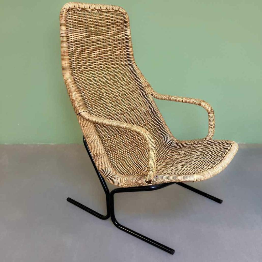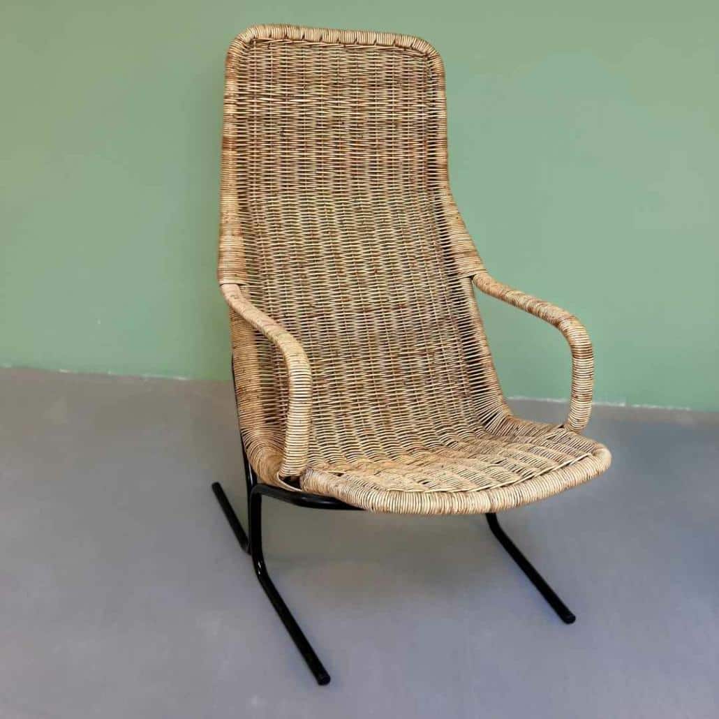 Stijlvolle rotan lounge stoel, ontworpen door Dirk van Sliedregt in midcentury vorige eeuw. Het onderstel is een zwart stalen buisframe. De vintage stoel zit heerlijk en is in een prachtige gebruikte conditie.