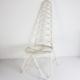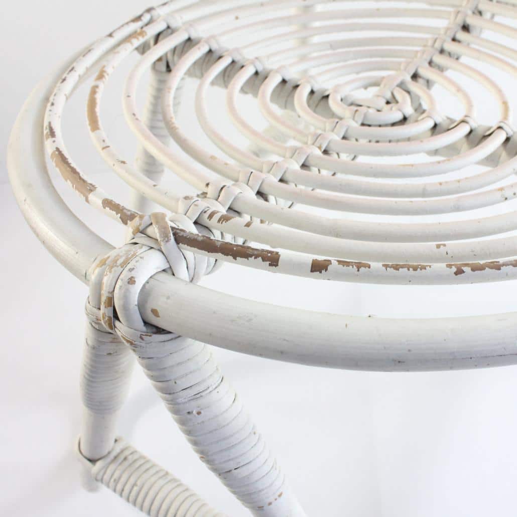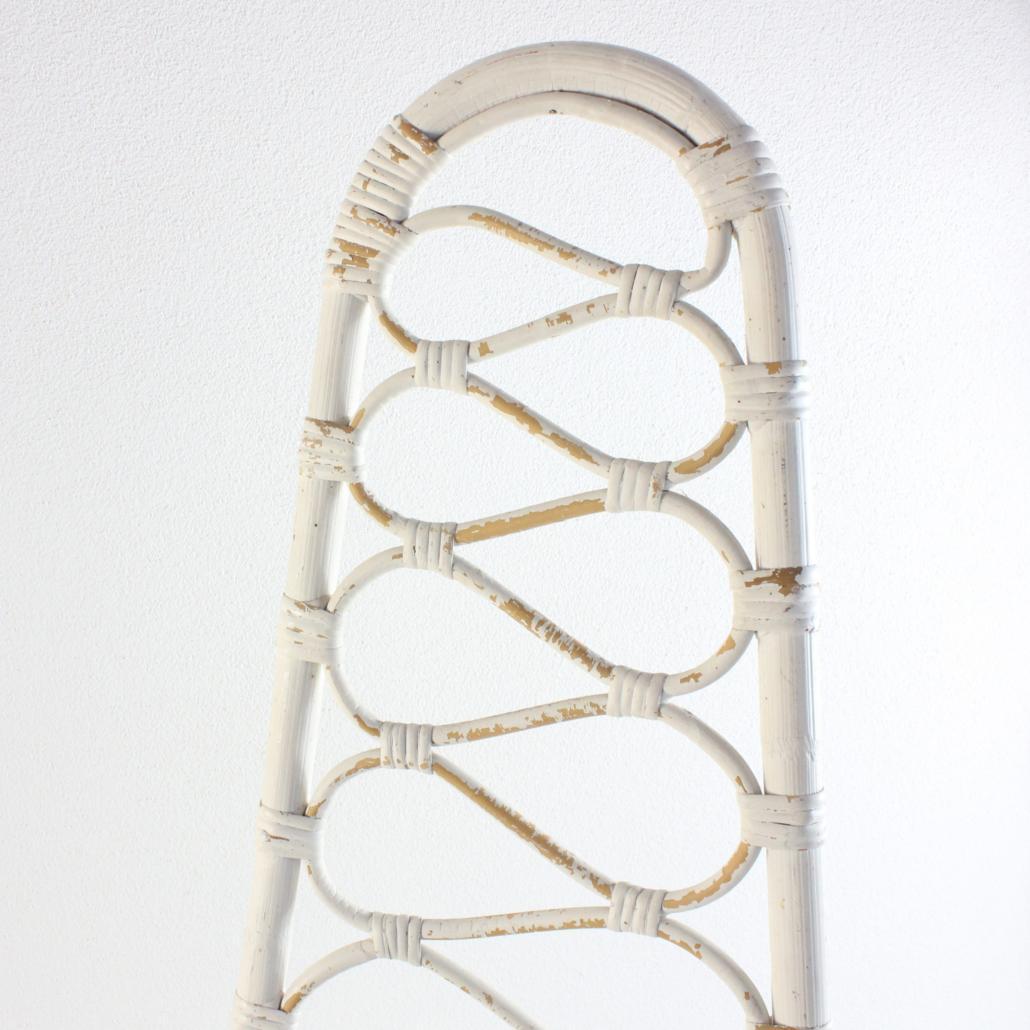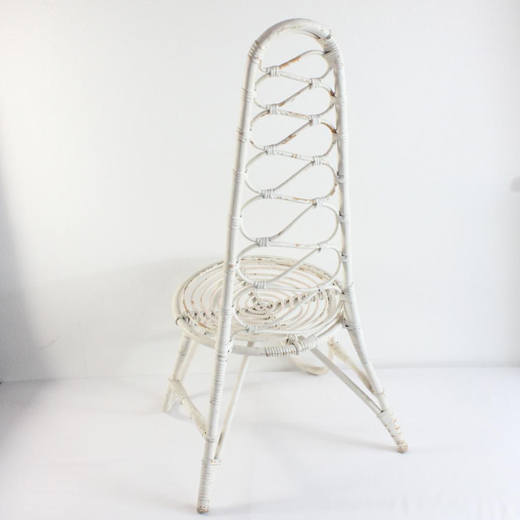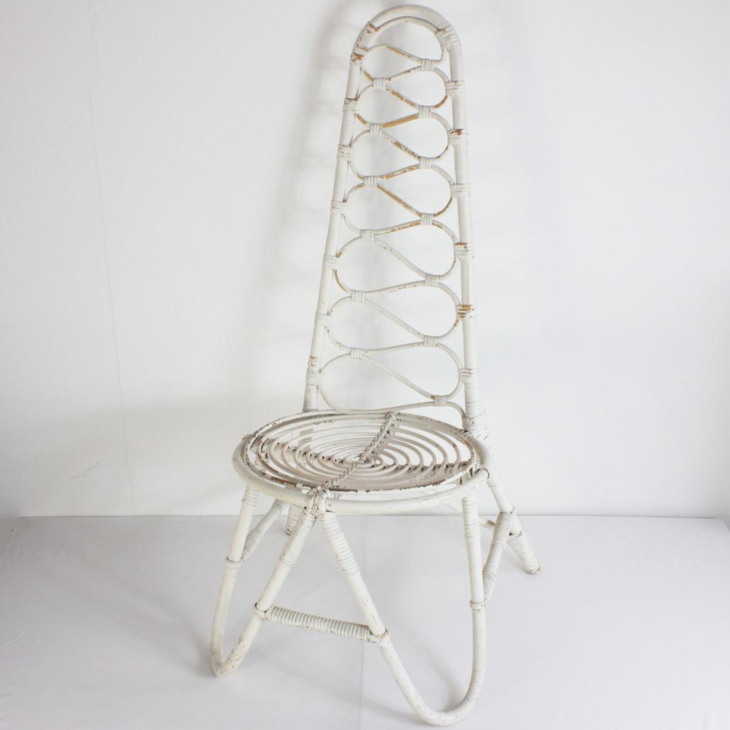 Zeldzame vintage rotan stoel uit de jaren ’50. Het ontwerp wordt toegeschreven aan Dirk van Sliedregt voor Rohe Noordwolde. Ik denk dat de stoel later wit gespoten is. Er is heel wat verf afgesleten, zie foto’s. Ik heb nog een exemplaar te koop, waarbij de staat van de witte verf beter is, zie hieronder.