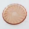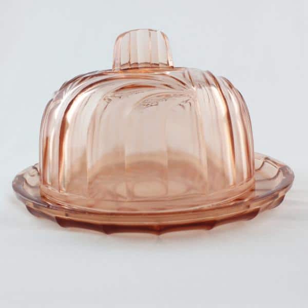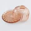 Prachtige roze kaasstolp van persglas, ook wel depressieglas genoemd. Diameter: 21 cm.