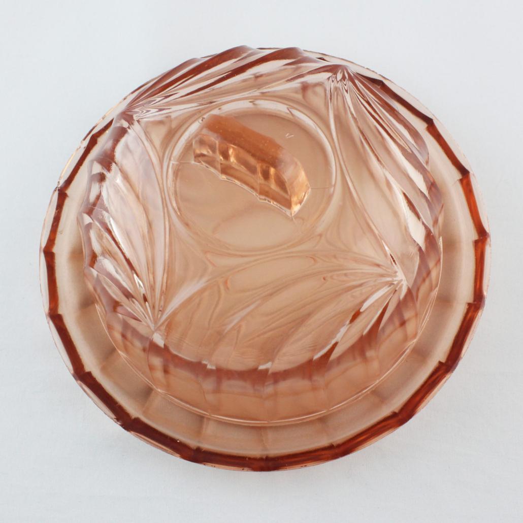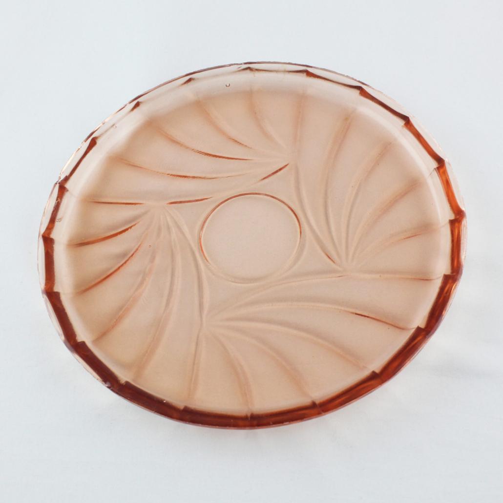 Prachtige roze kaasstolp van persglas, ook wel depressieglas genoemd. Diameter: 21 cm.