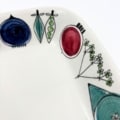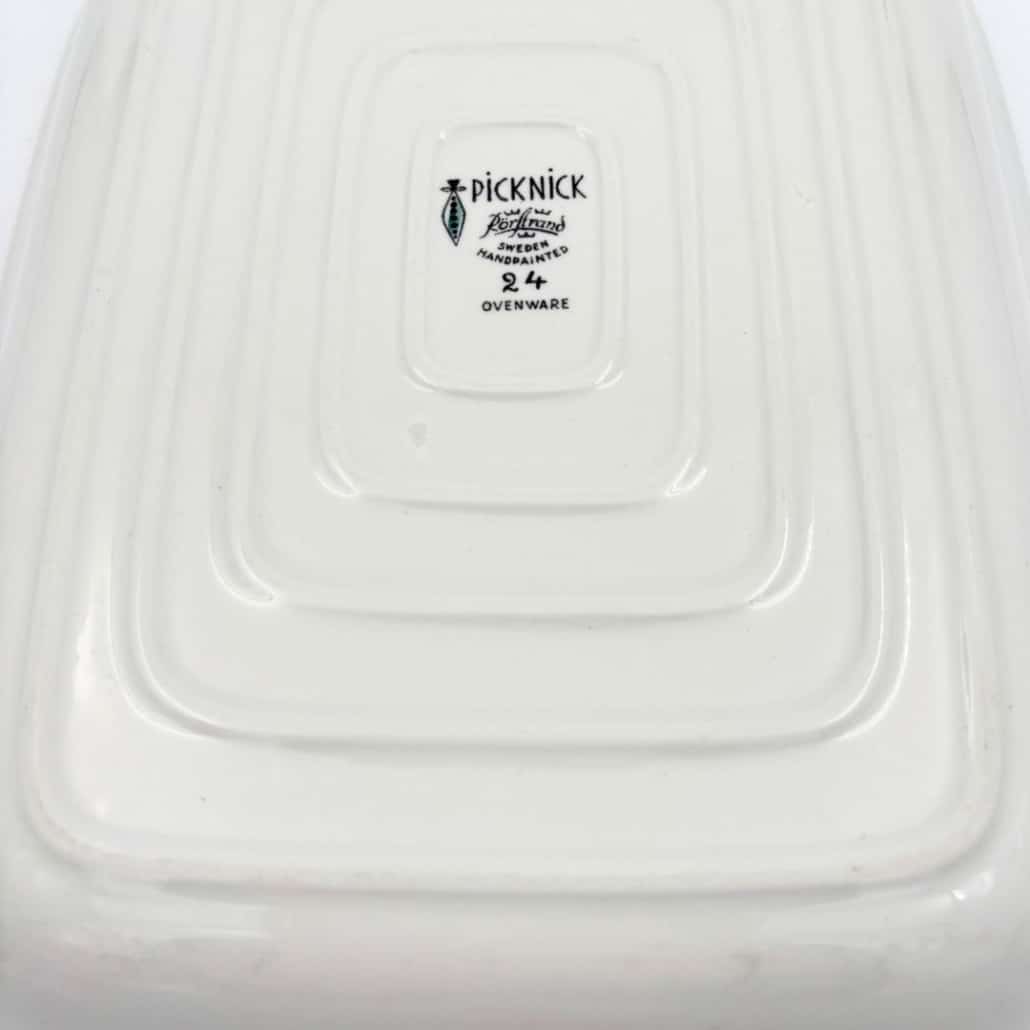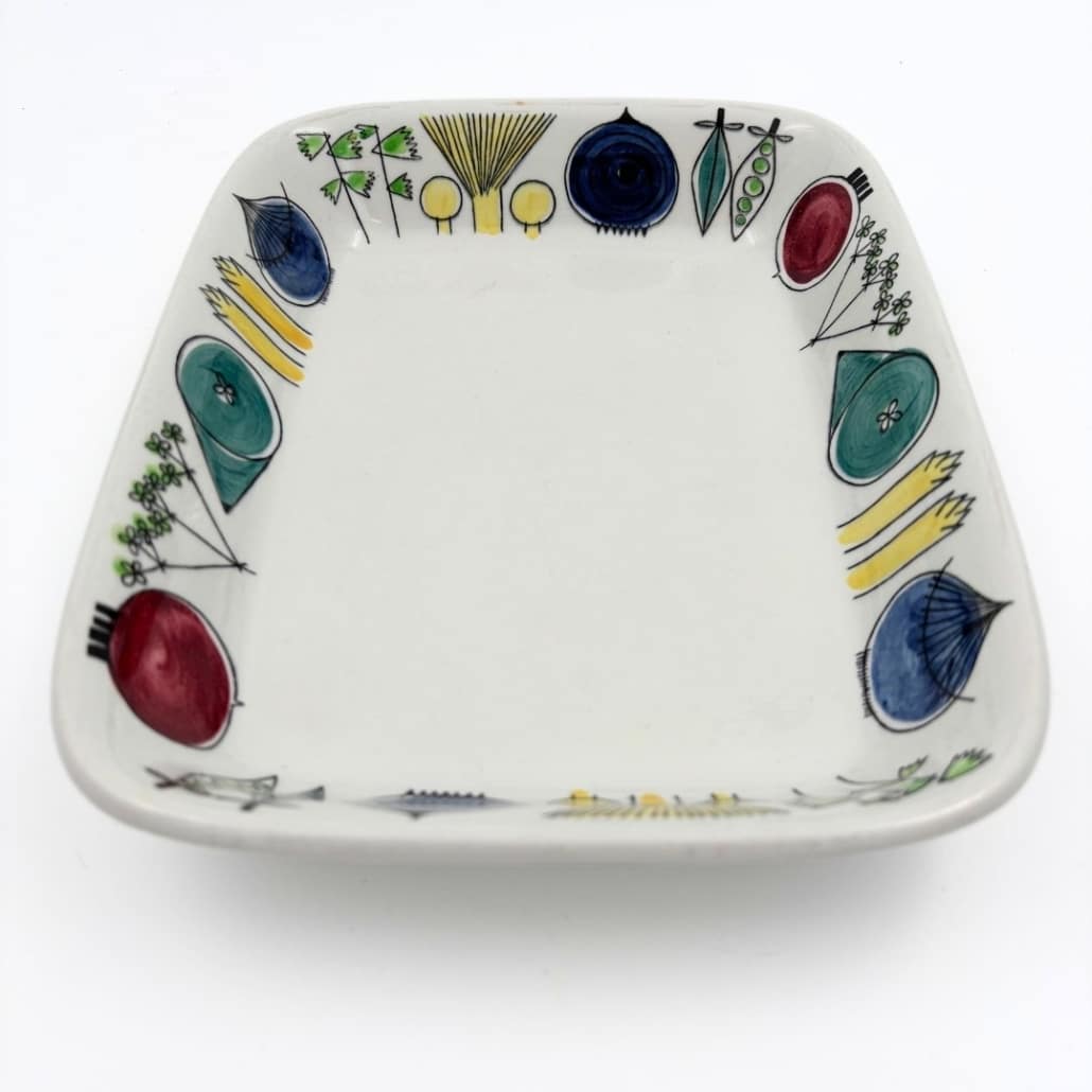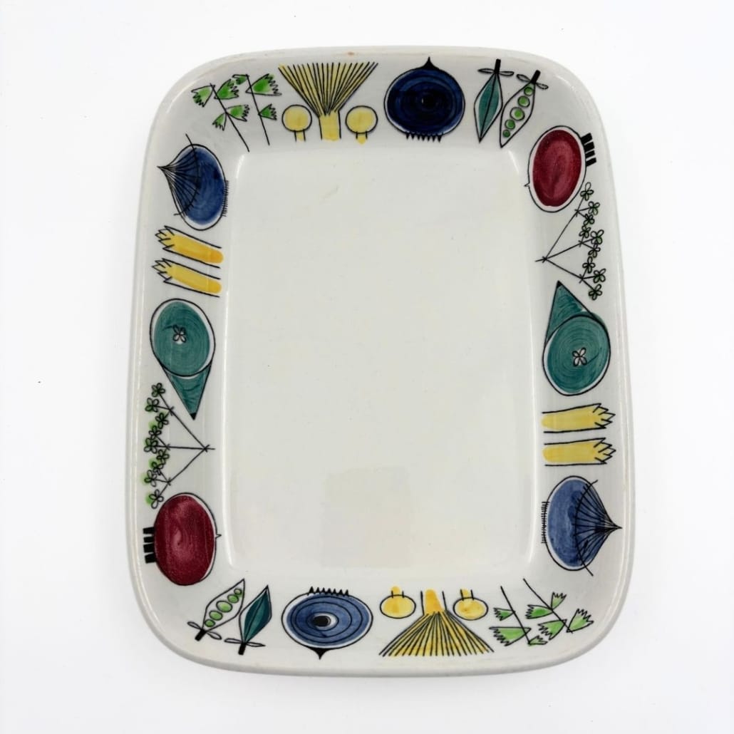 Het Rörstrand Picknick servies is ontworpen door Marianne Westman. Deze rechthoekige schaal nummer 24 heeft het kenmerkende speelse motief met prachtige abstracte vormen van de groenten. Een echte Zweedse design klassieker.