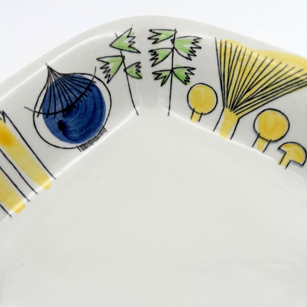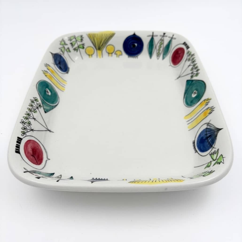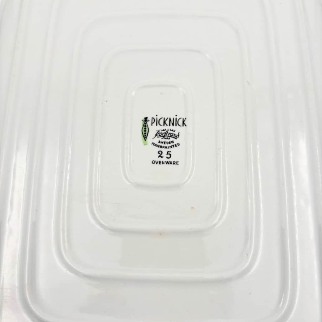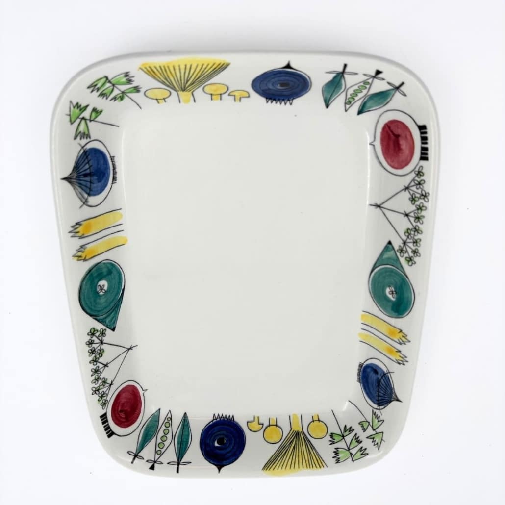 Het Rörstrand Picknick servies is ontworpen door Marianne Westman. Deze rechthoekige schaal nummer 25 heeft het kenmerkende speelse motief met prachtige abstracte vormen van de groenten. Een echte Zweedse design klassieker.