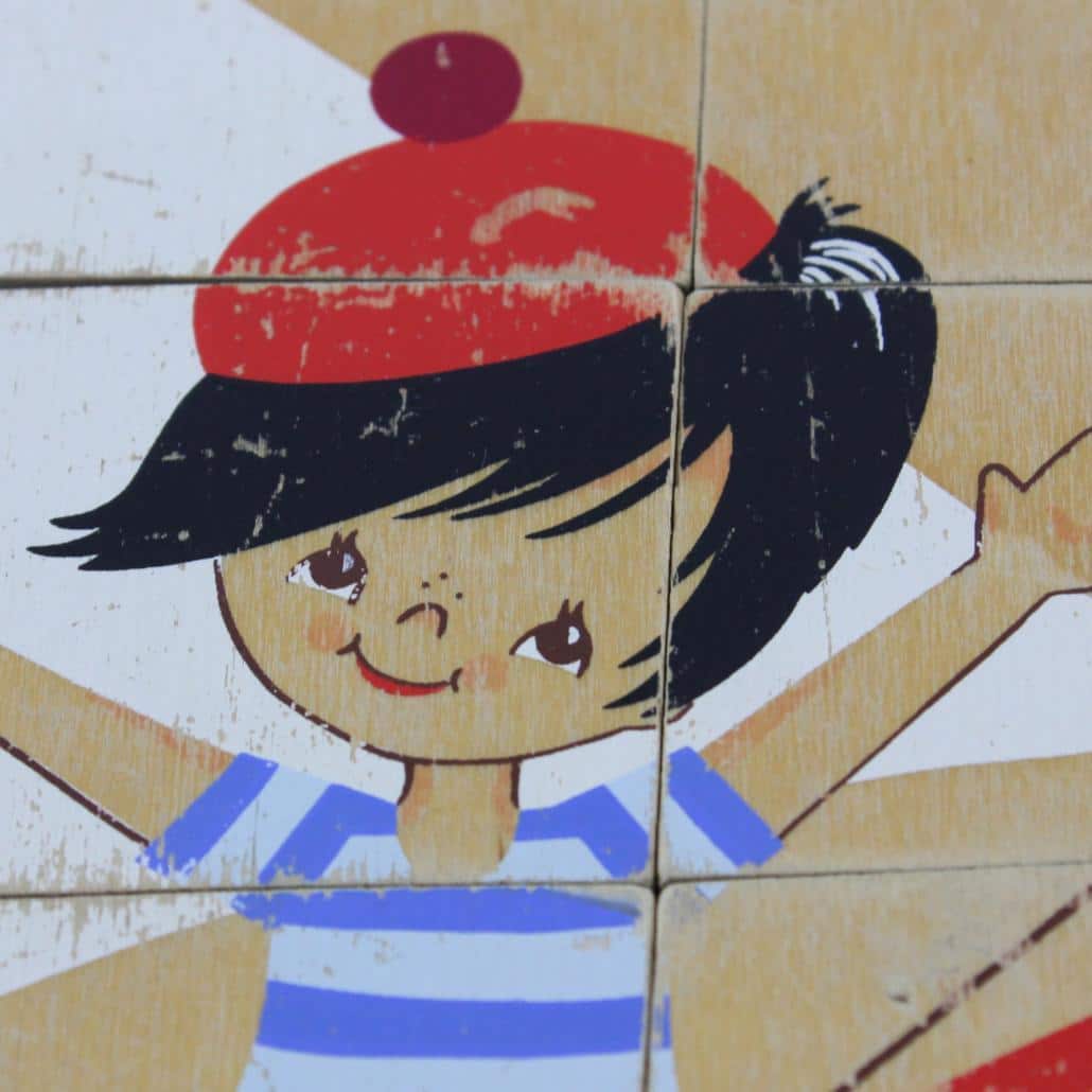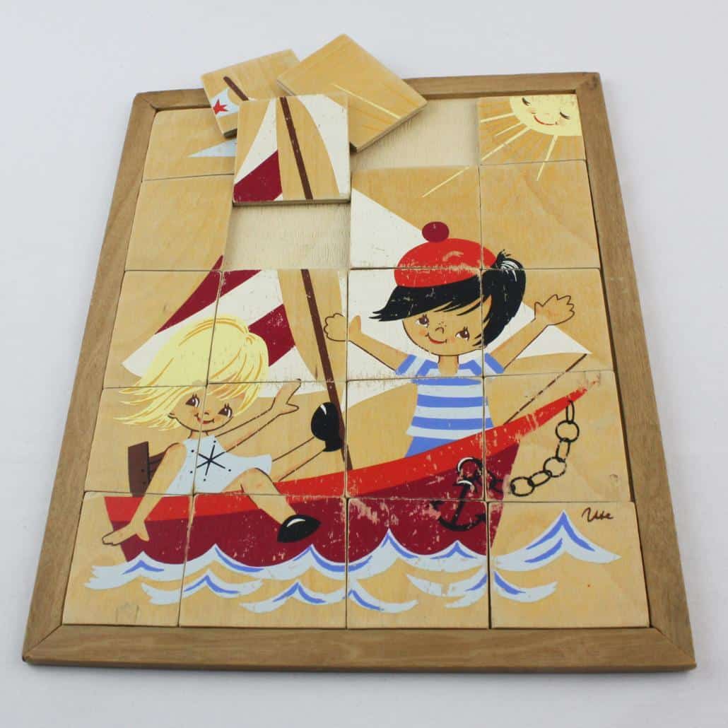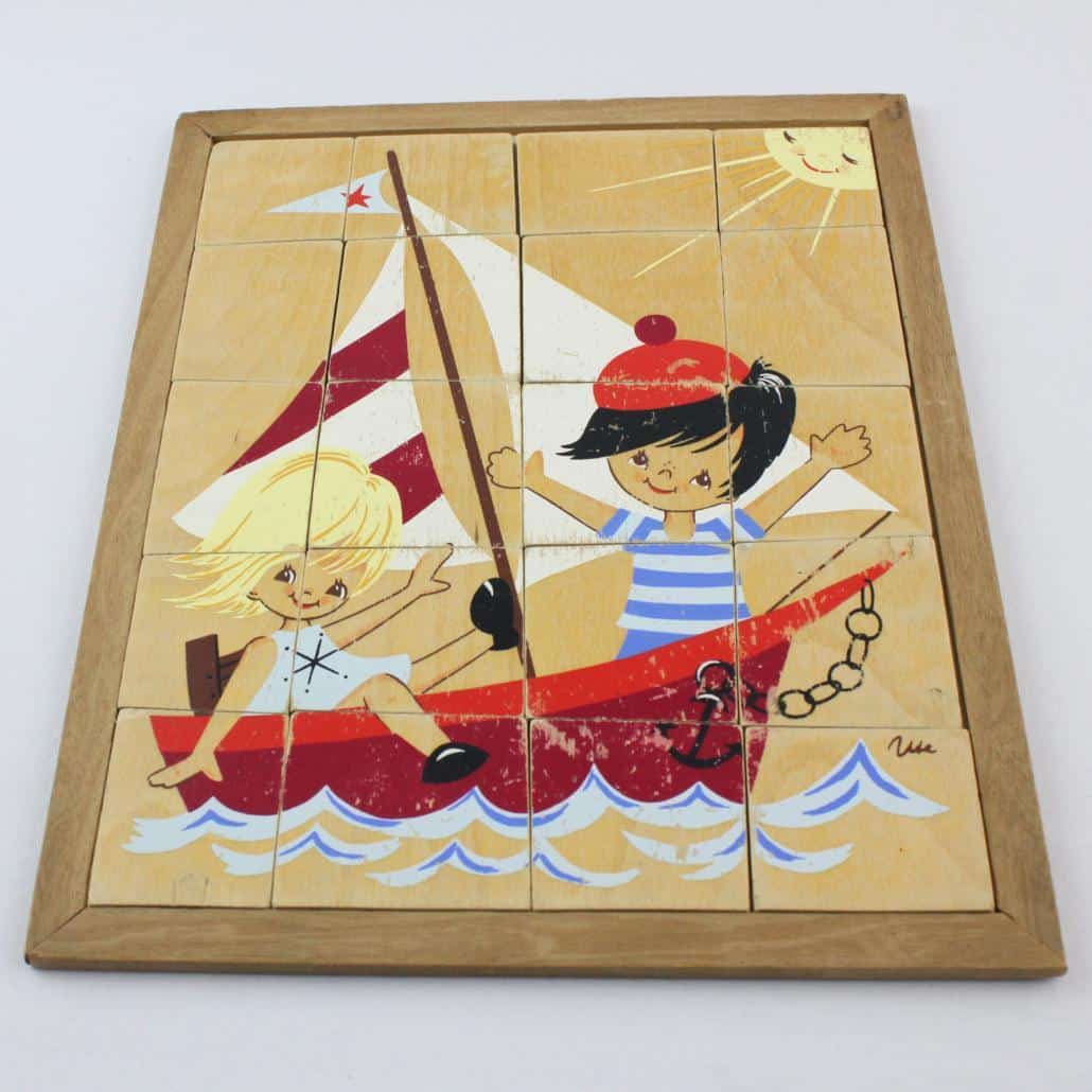 Schattige houten puzzel met een zeilboot. De verf is hier en daar prachtig versleten.