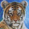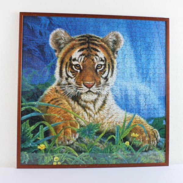 Dit schilderij is zo heerlijk kitch. Ingelijste tijgerpuzzel. Knalt van je muur in een bohemian interieur.