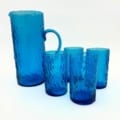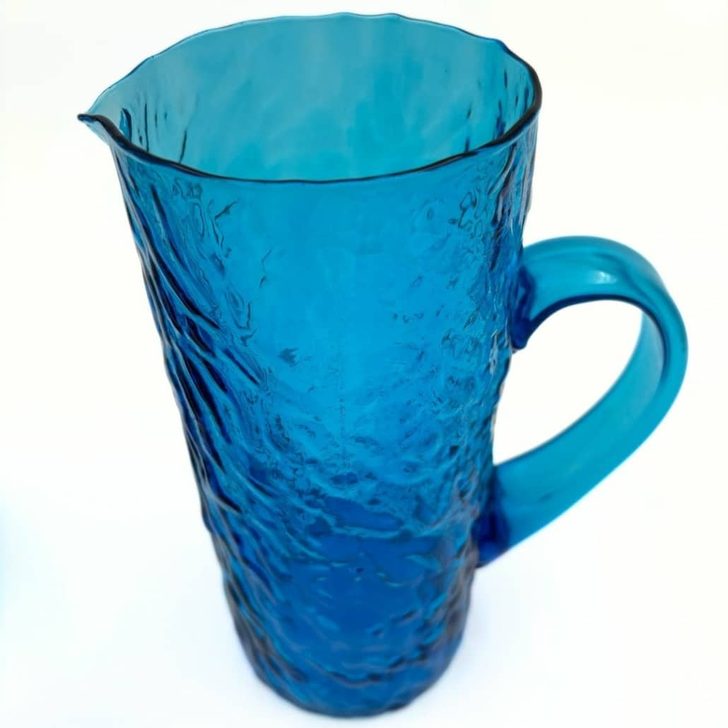 Dit is echt een adembenemende set. Een karaf met 4 glazen in prachtig helder blauw glas. Het oppervlakte van het glas is ruw en geribbeld wat een mooi effect geeft als het licht erdoorheen schijnt. Eye-catcher op tafel en in de servieskast.