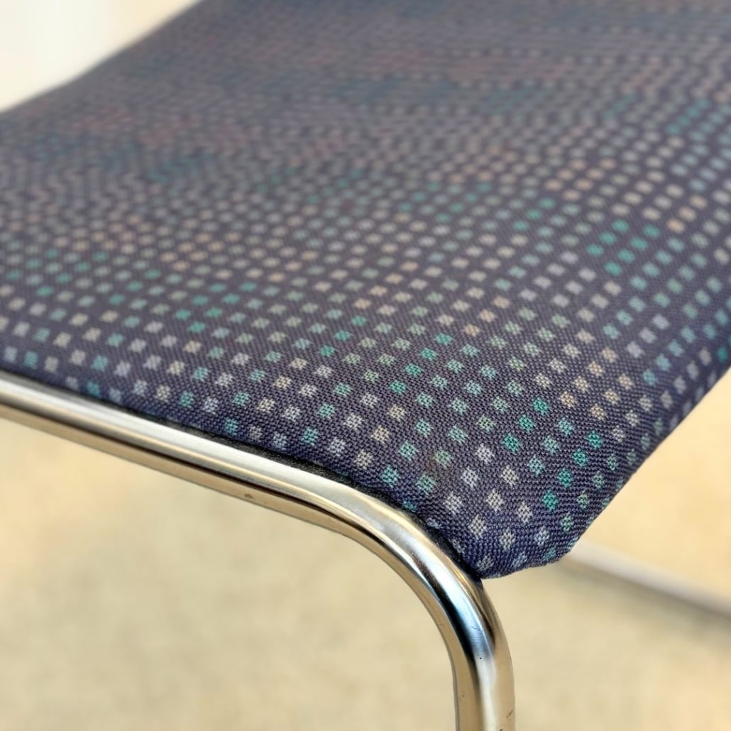 Dit is een geweldige set buisframe stoelen ontworpen door Walter Antonius voor ’t Spectrum in 1970. Het model heet SE09. De vintage stoelen zijn heel comfortabel. De bekleding heeft een vrolijk design in moderne kleuren. De stof is nog in mooi conditie en netjes, op een vlekje na op één van de stoelen (zie foto).