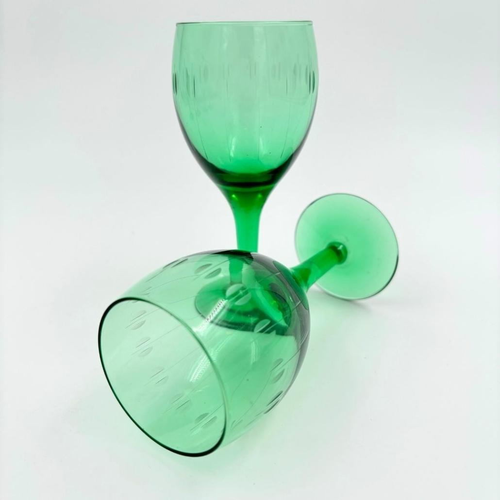 Deze set vintage likeurglazen heeft een prachtige groene kleur. In de kelk is een subtiel patroon geslepen. Mooi voor op tafel, maar in de servieskast alleen zijn ze ook al een lust voor het oog.