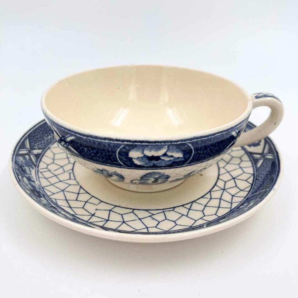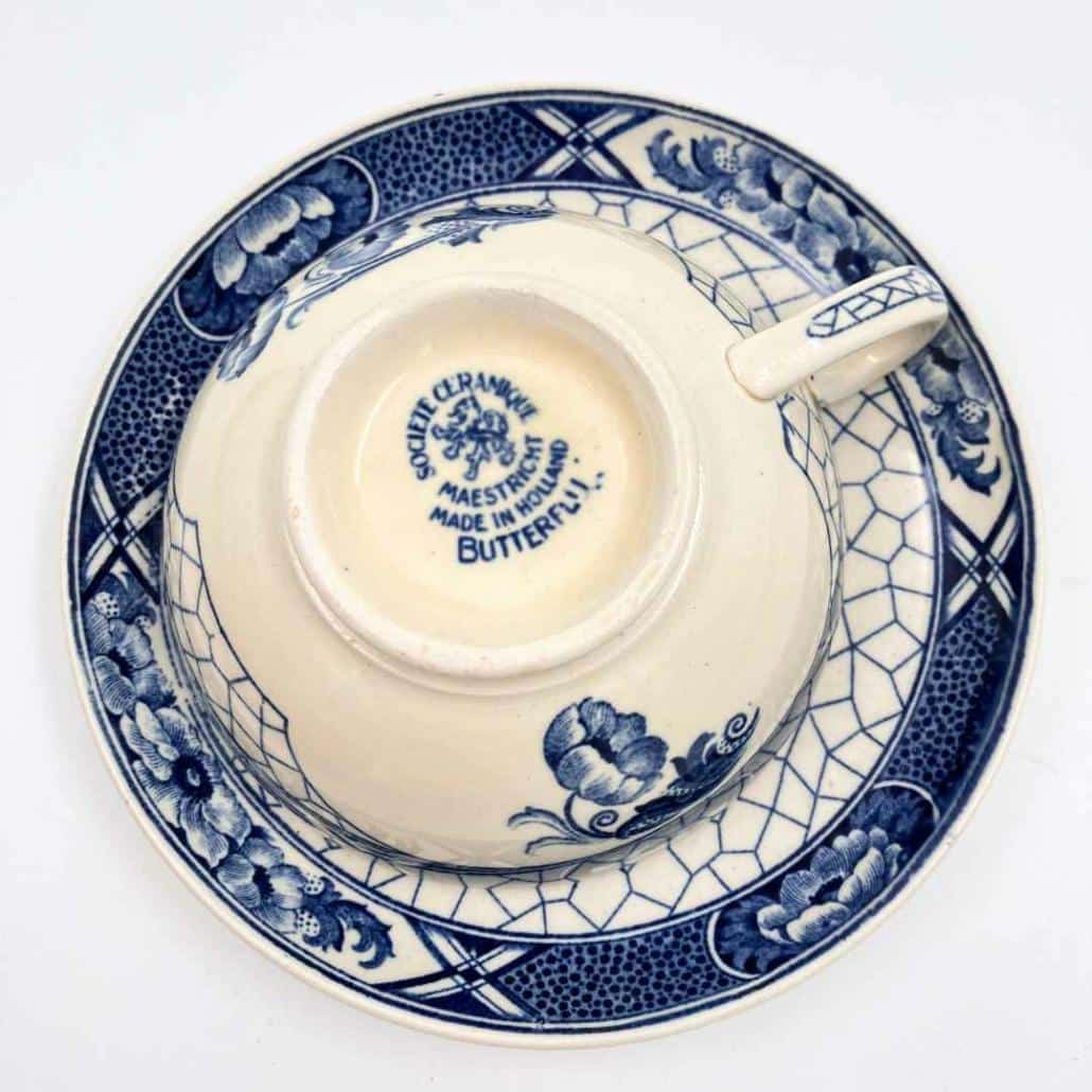 Kop en schotel van het Butterflij (Butterfly) servies van Société Céramique Maestricht. Fijne florale decoratie met natuurlijk een vlinder. In mooie gebruikte conditie, mini-chipje kan voorkomen.