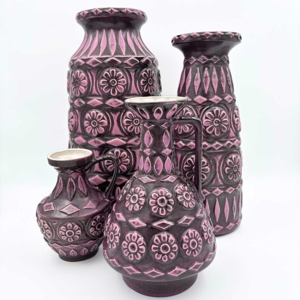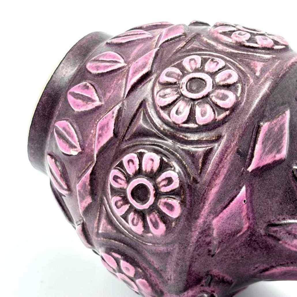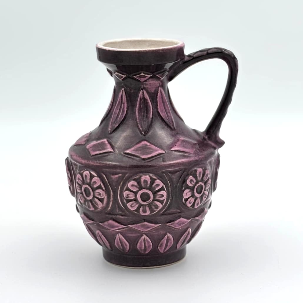 Deze fijne vintage Bay vaas, ontworpen door Bodo Mans, is een mooi voorbeeld van West Germany keramiek uit de jaren ’60–’70. Het rijke reliëfdecor met florale en geometrische motieven, uitgevoerd in donkerbruin met paarsroze accenten, geeft de vaas een uitgesproken grafisch karakter. Perfect als decoratief object op een plank, bijzettafel of in een vitrinekast.