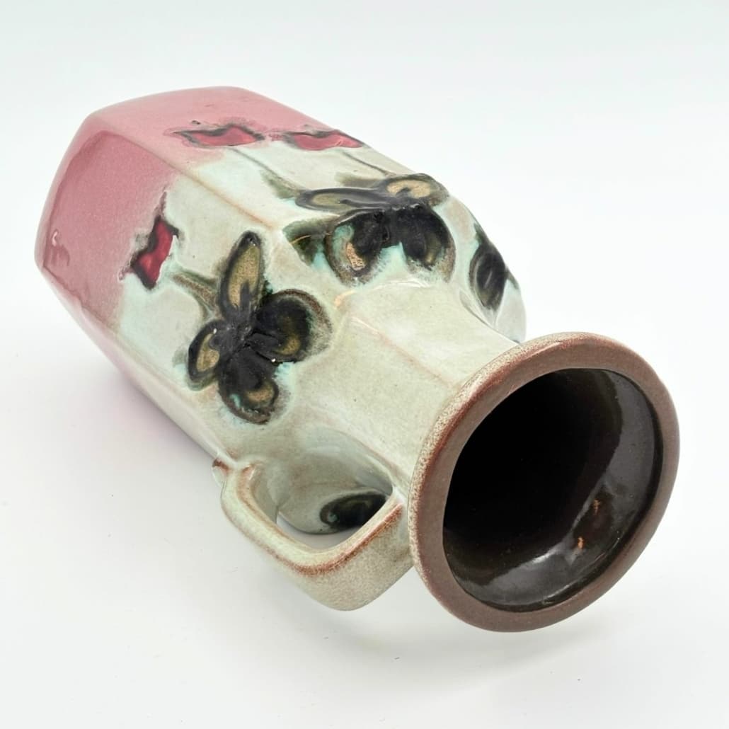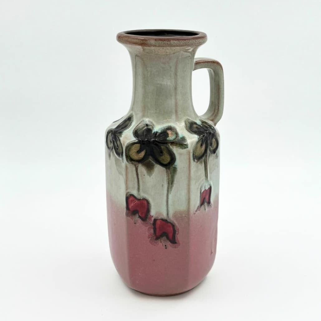 Deze vintage vaas uit West-Duitsland is een prachtig voorbeeld van het mid-century keramiekdesign. De vaas heeft een elegante, smalle hals en een handgreep. De decoratie toont handgeschilderde bloemen in warme tinten groen en zwart, gecombineerd met een subtiele roze ondergrond.