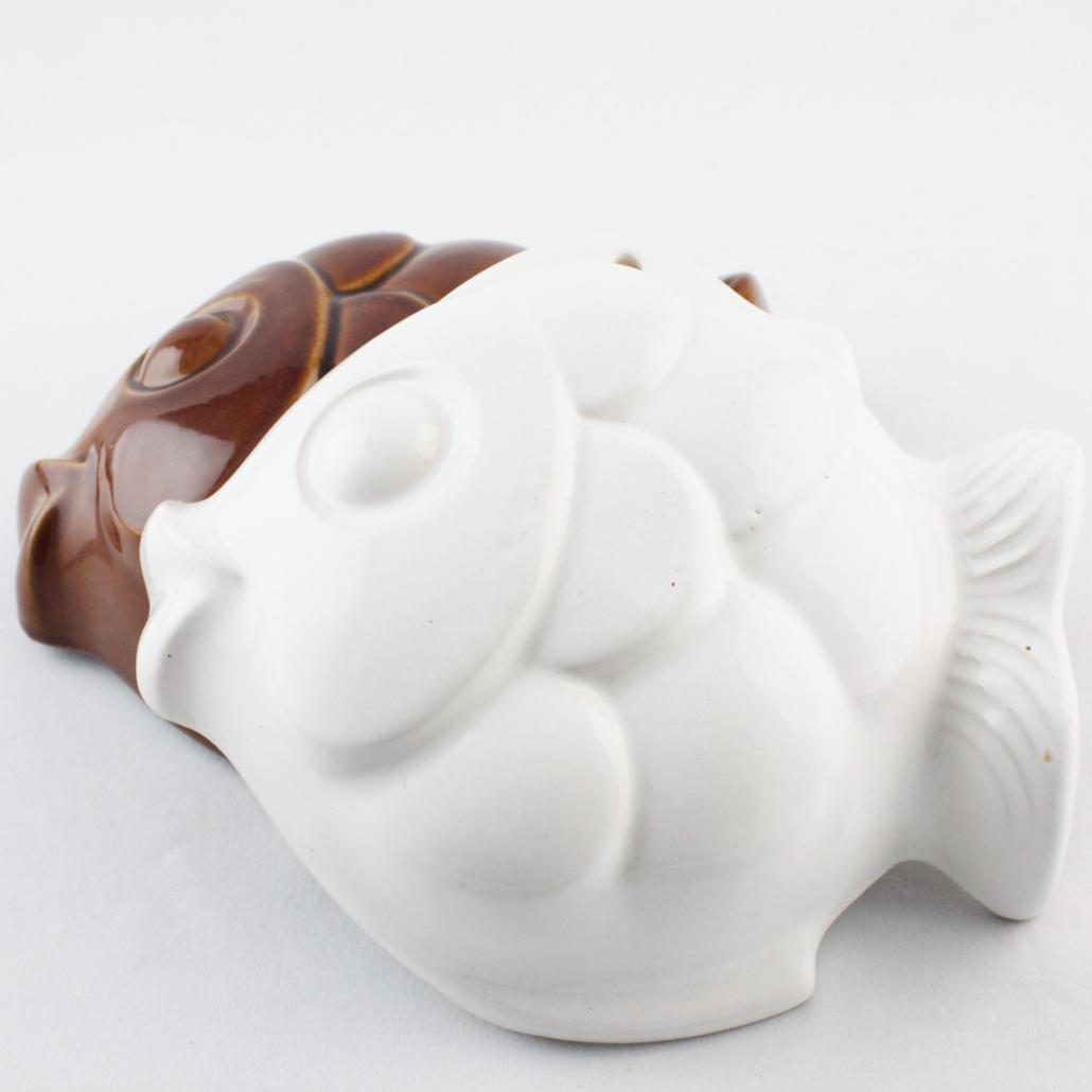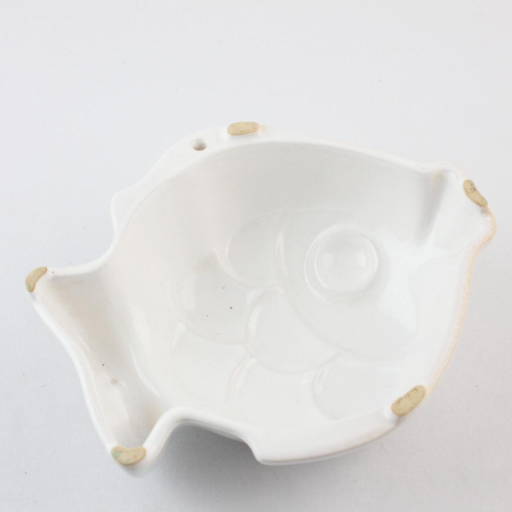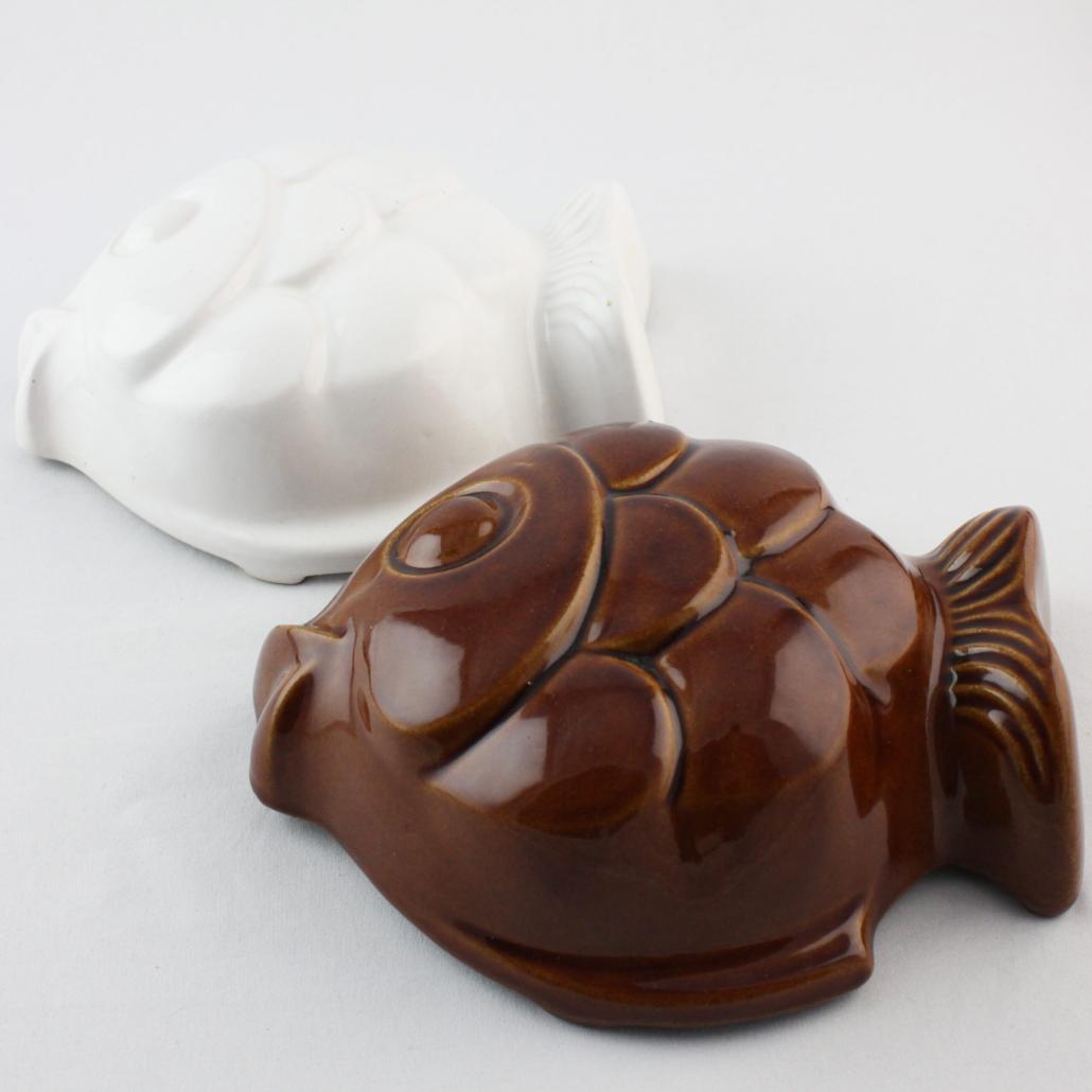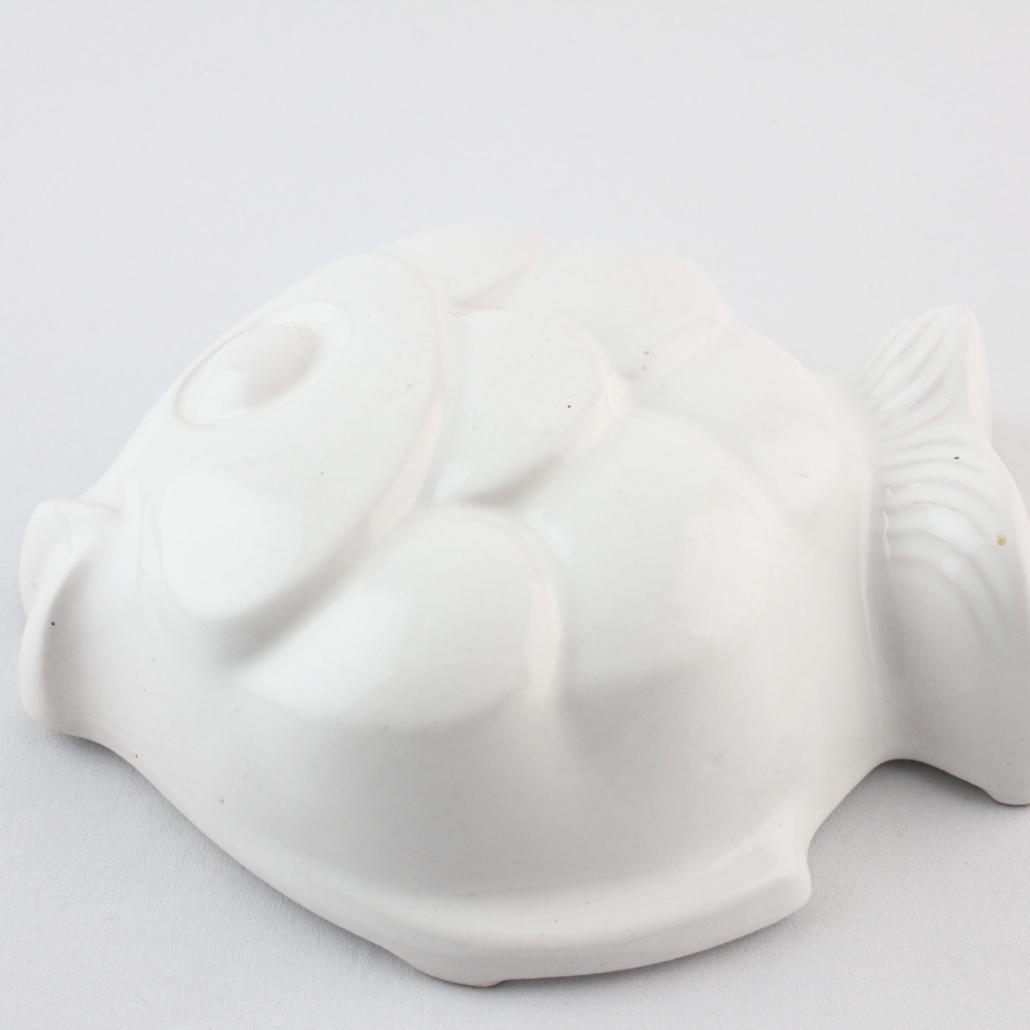 Speelse witte aardewerken bakvorm in de vorm van een vis. Je kunt er pudding of zalmmousse in maken, maar hij is ook prachtig op de keukenwand.