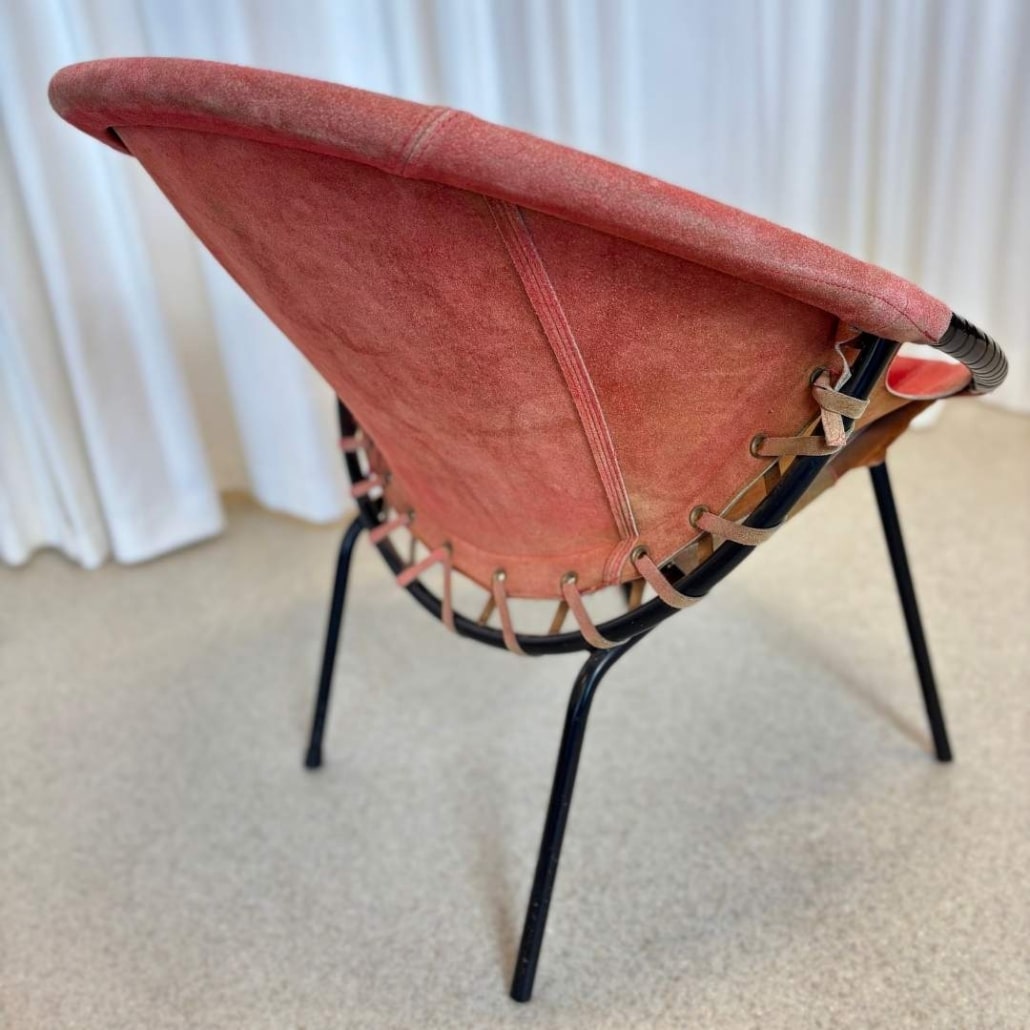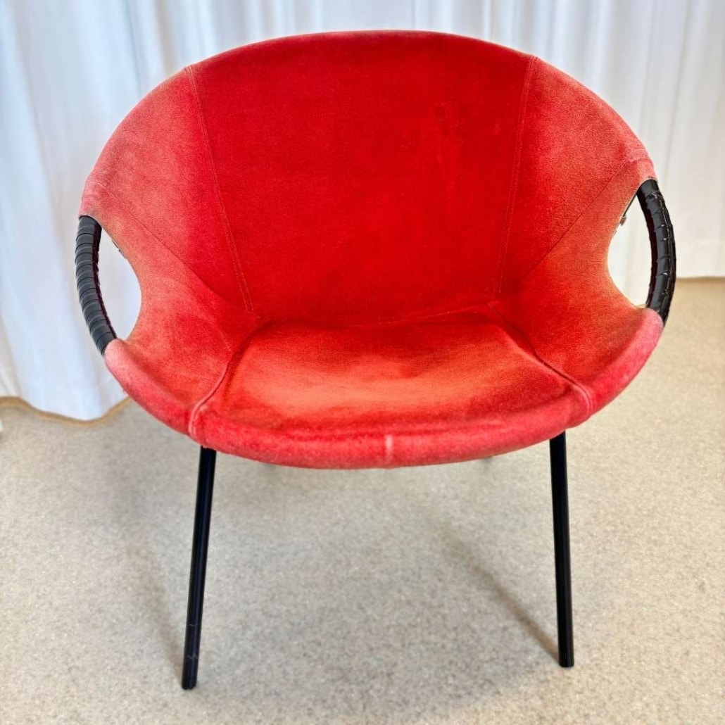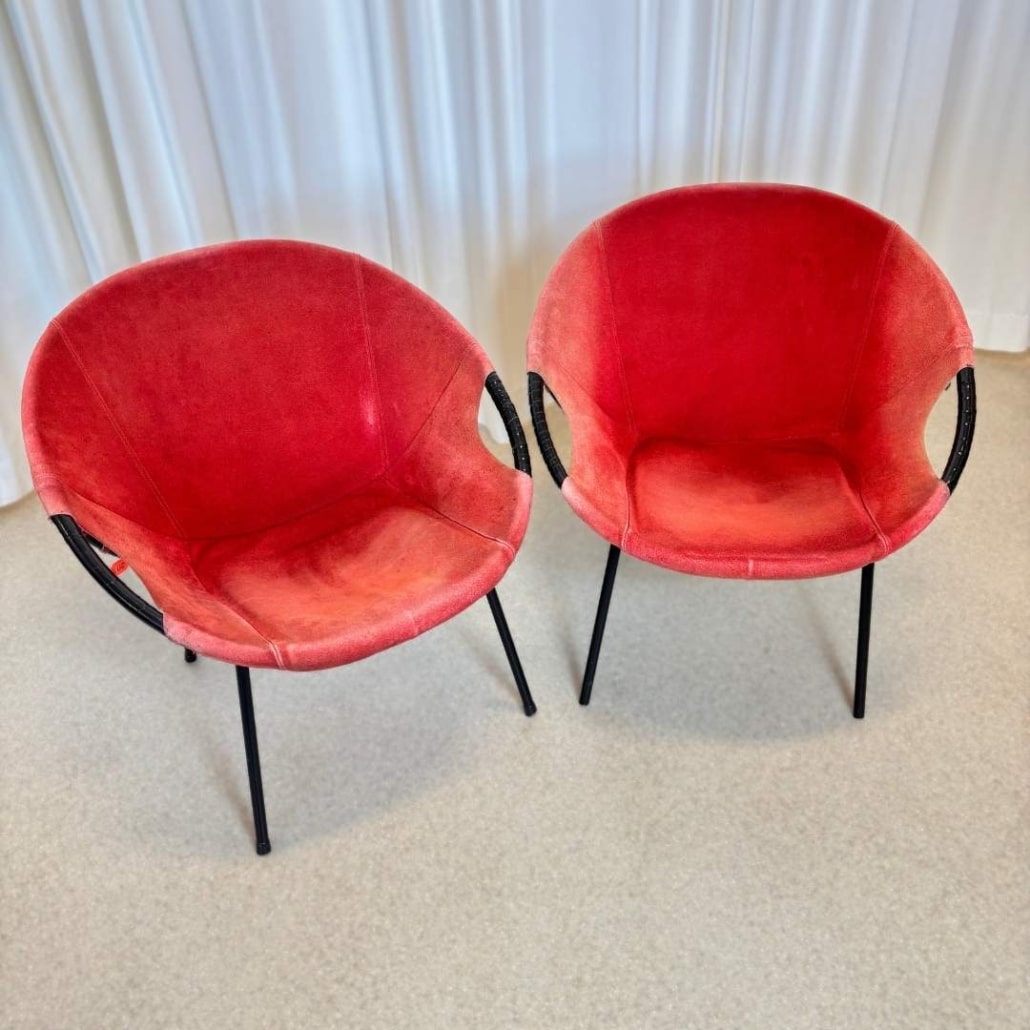 De fauteuils hebben een elegant ballonvormig ontwerp, met een ronde kuipzitting, open armleuningen en een slank zwart metalen onderstel. De rode suède bekleding geeft warmte en textuur, en hoewel de zitting wat verkleurd is door de jaren heen, draagt dit bij aan de authentieke uitstraling van het vintage karakter.