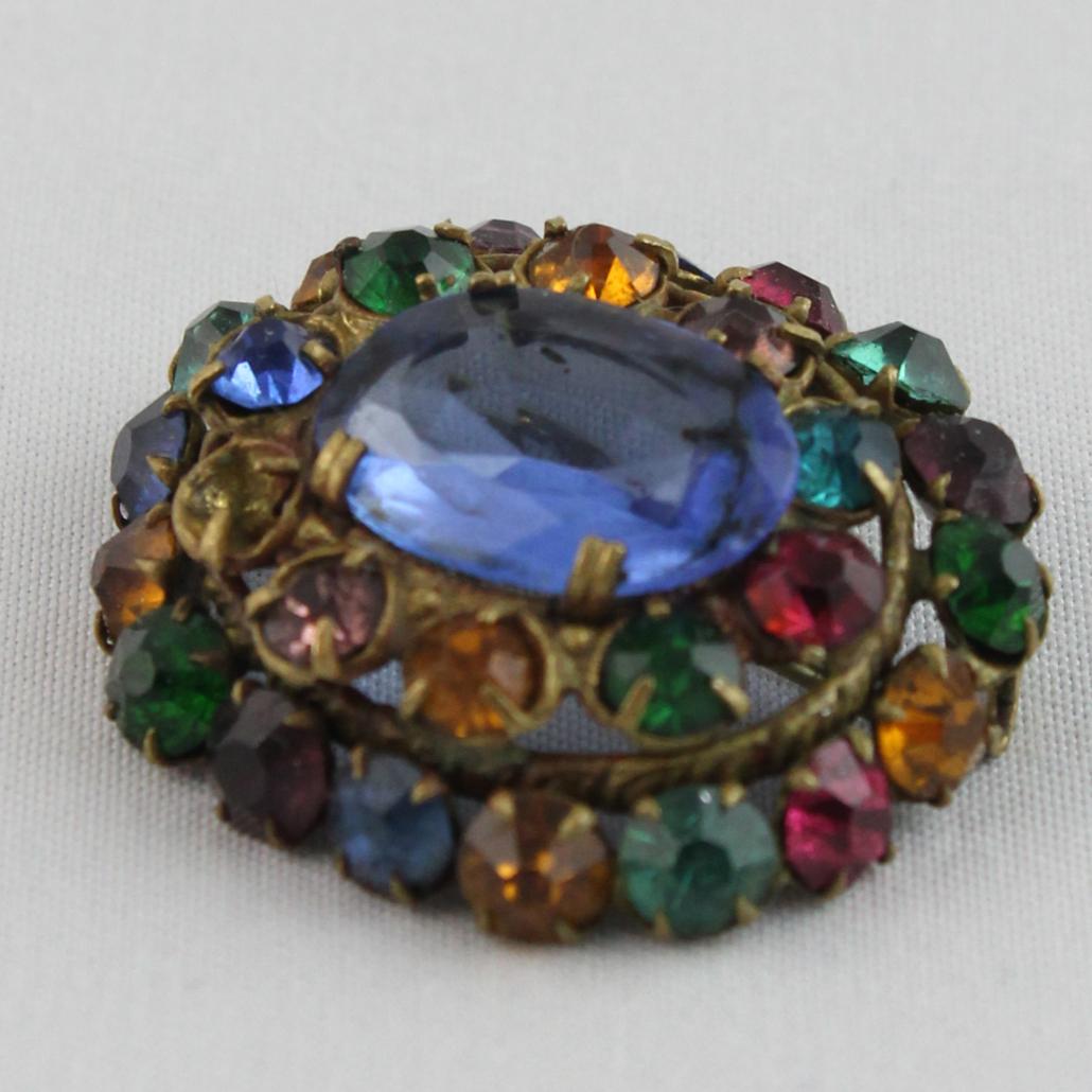 Vrolijke vintage broche in allerlei kleuren met een grote blauwe ‘steen’. Ongeveer 4 cm.
