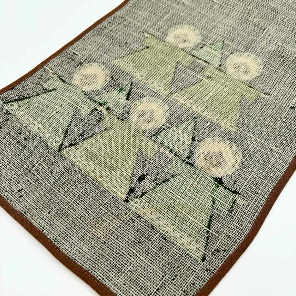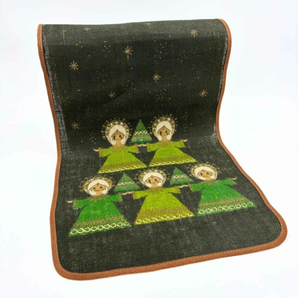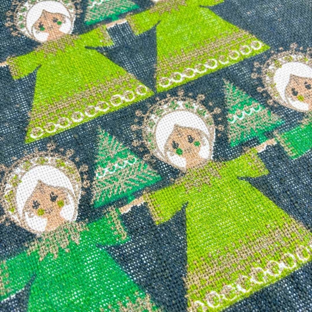 Deze Deense vintage tafelloper of klein kleedje heeft een prachtige tekening. Scandinavische eenvoudige vormen op z’n best. De kerstengeltjes in het groen zijn op jute gedrukt. Ze fleuren je kersttafel meteen op en veel meer heb je niet nodig.