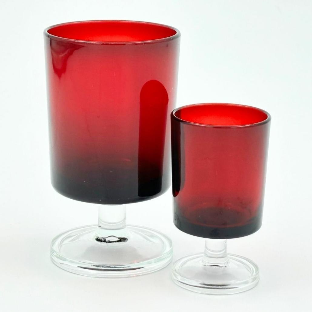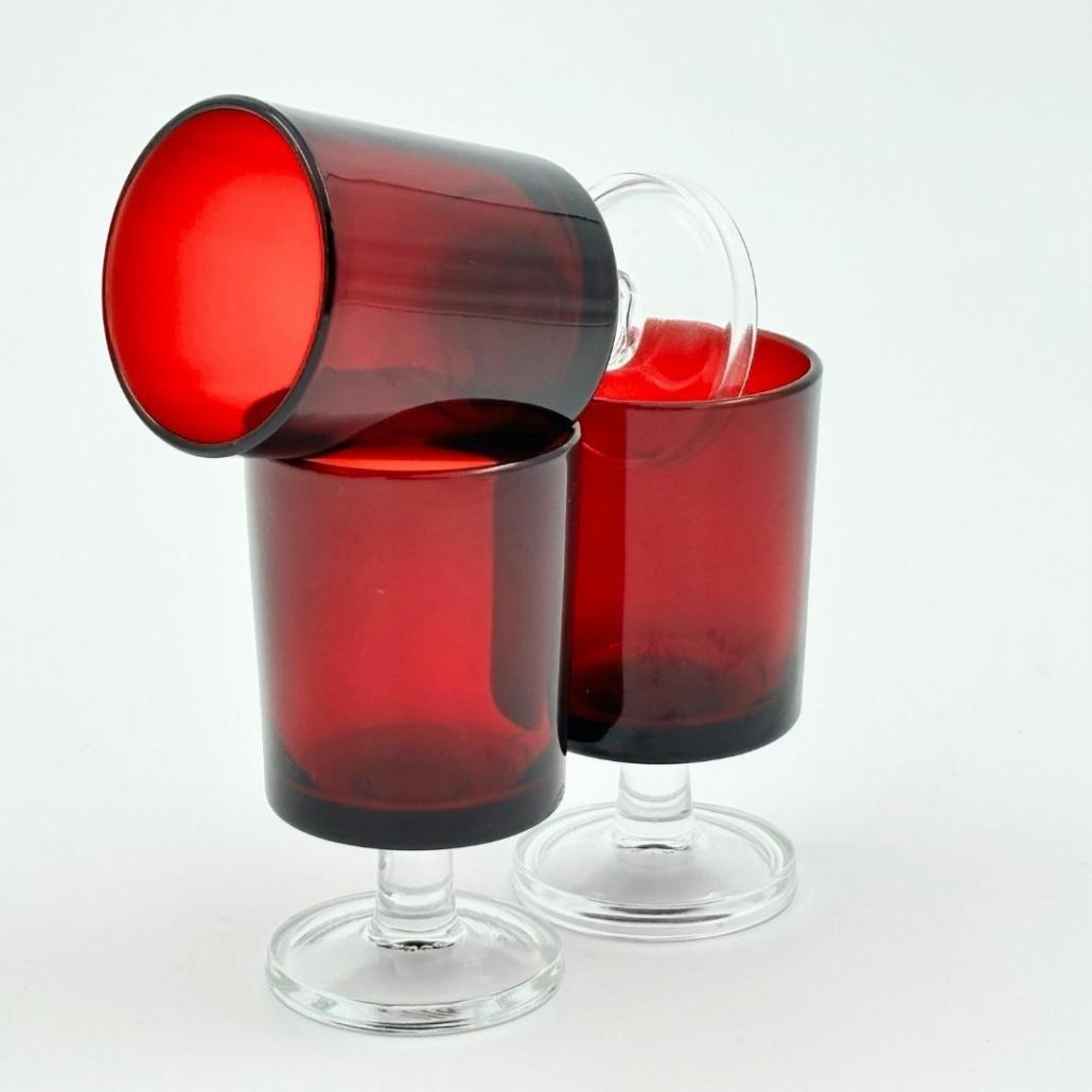 Deze borrelglaasjes uit de Luminarc Cavalier serie komen uit de jaren ’70. De serie bestaat uit borrelglazen, wijnglazen/portglazen en champagne coupes en is uitgegeven in rood, groen, amber en rookglas.