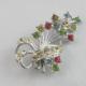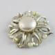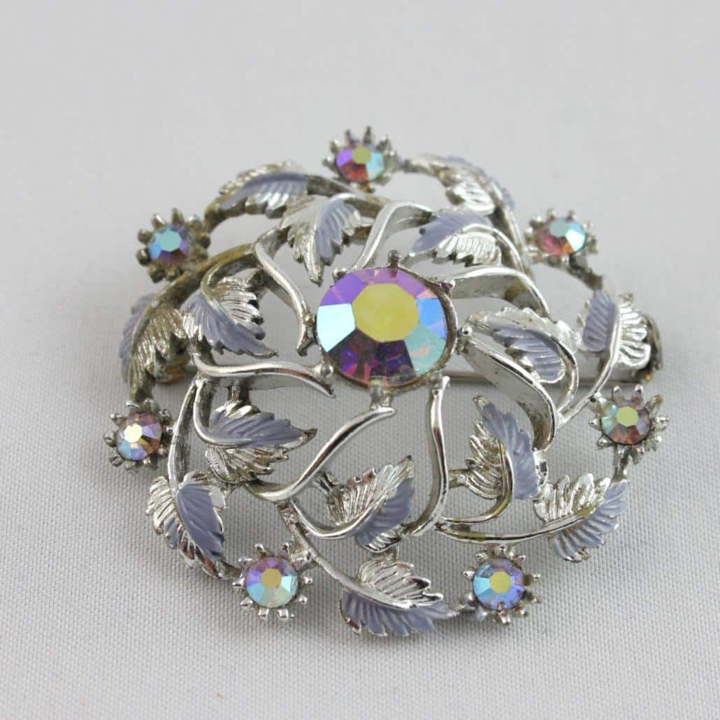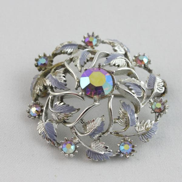 Prachtige vintage broche met fijne blaadjes met lila gloed en schitterende brass steentjes. Diameter ongeveer 5 cm.