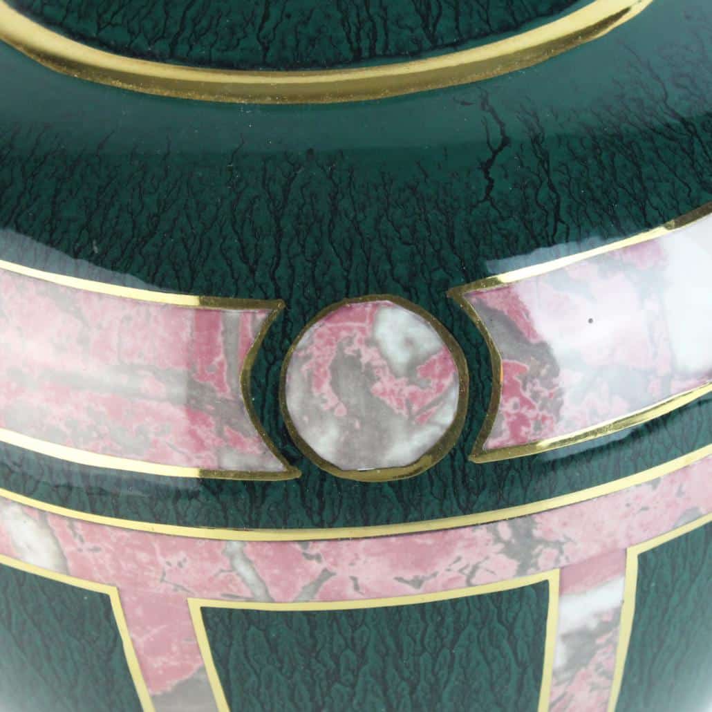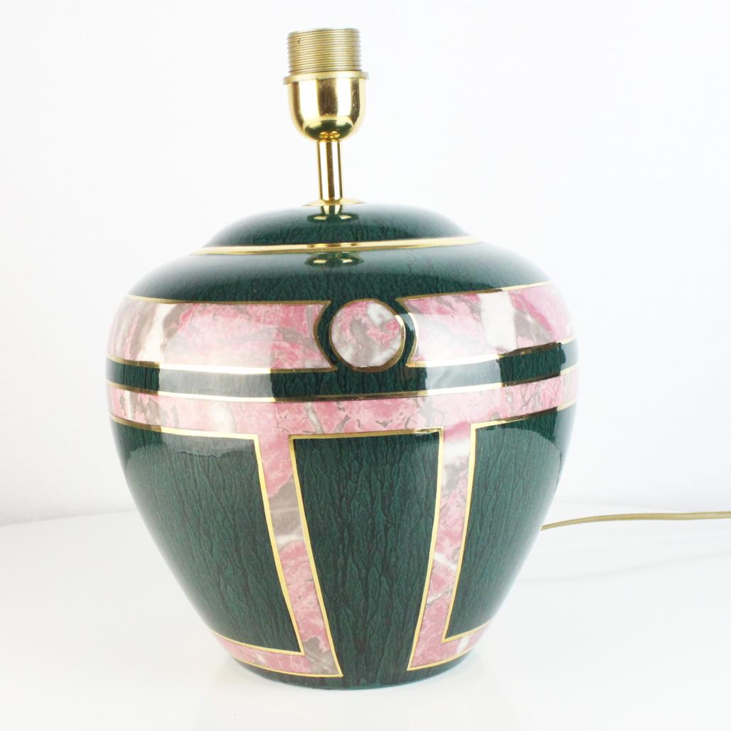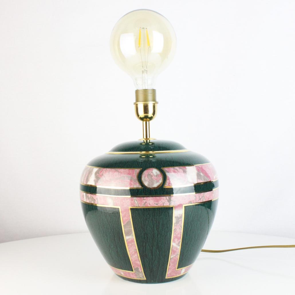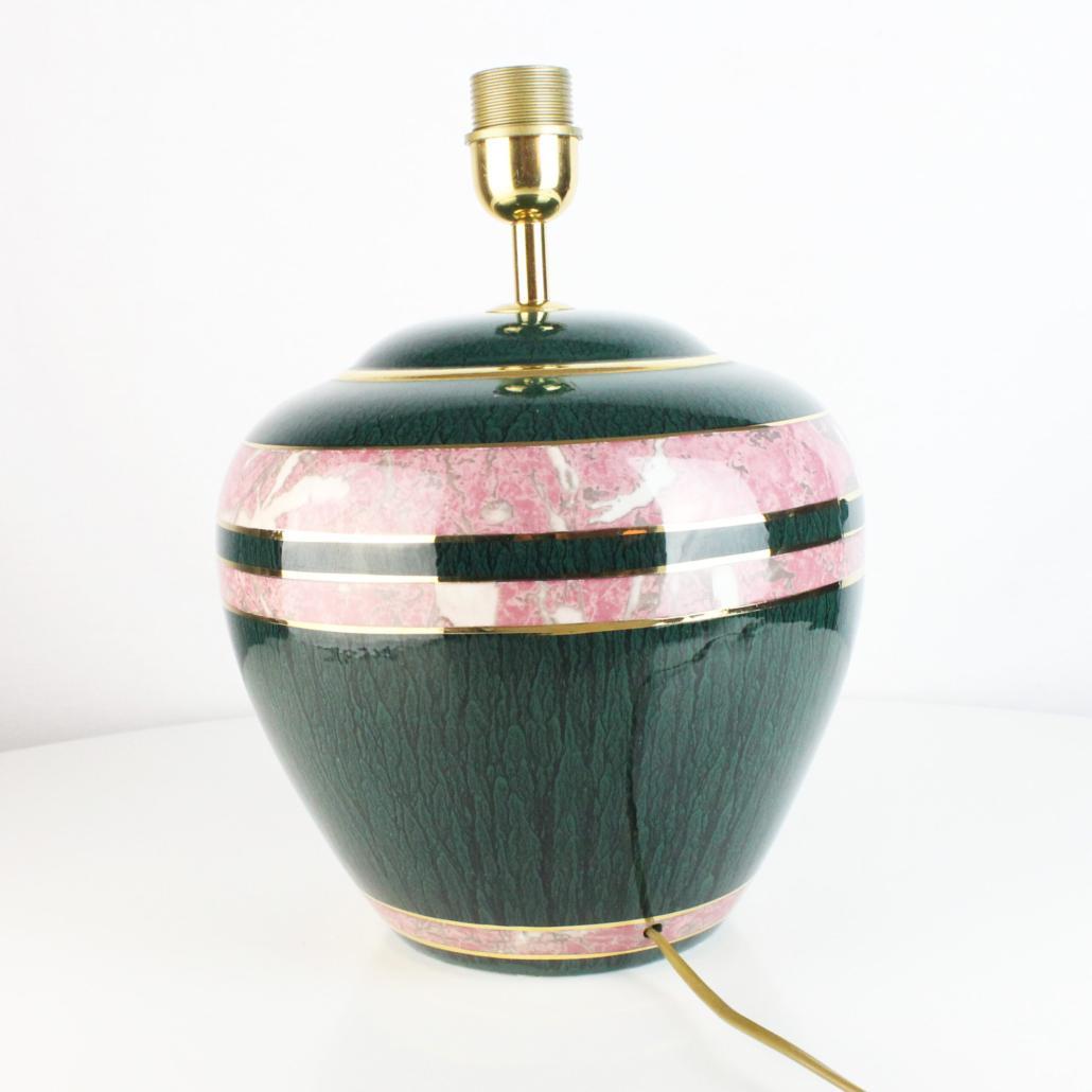 Geweldige vintage tafellamp in Hollywood Regency style. Groen en roze gemarmerd, met gouden details. In mooie vintage conditie.