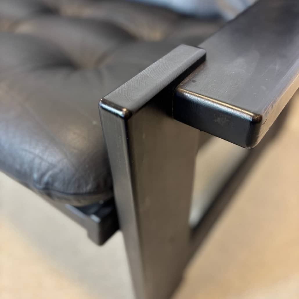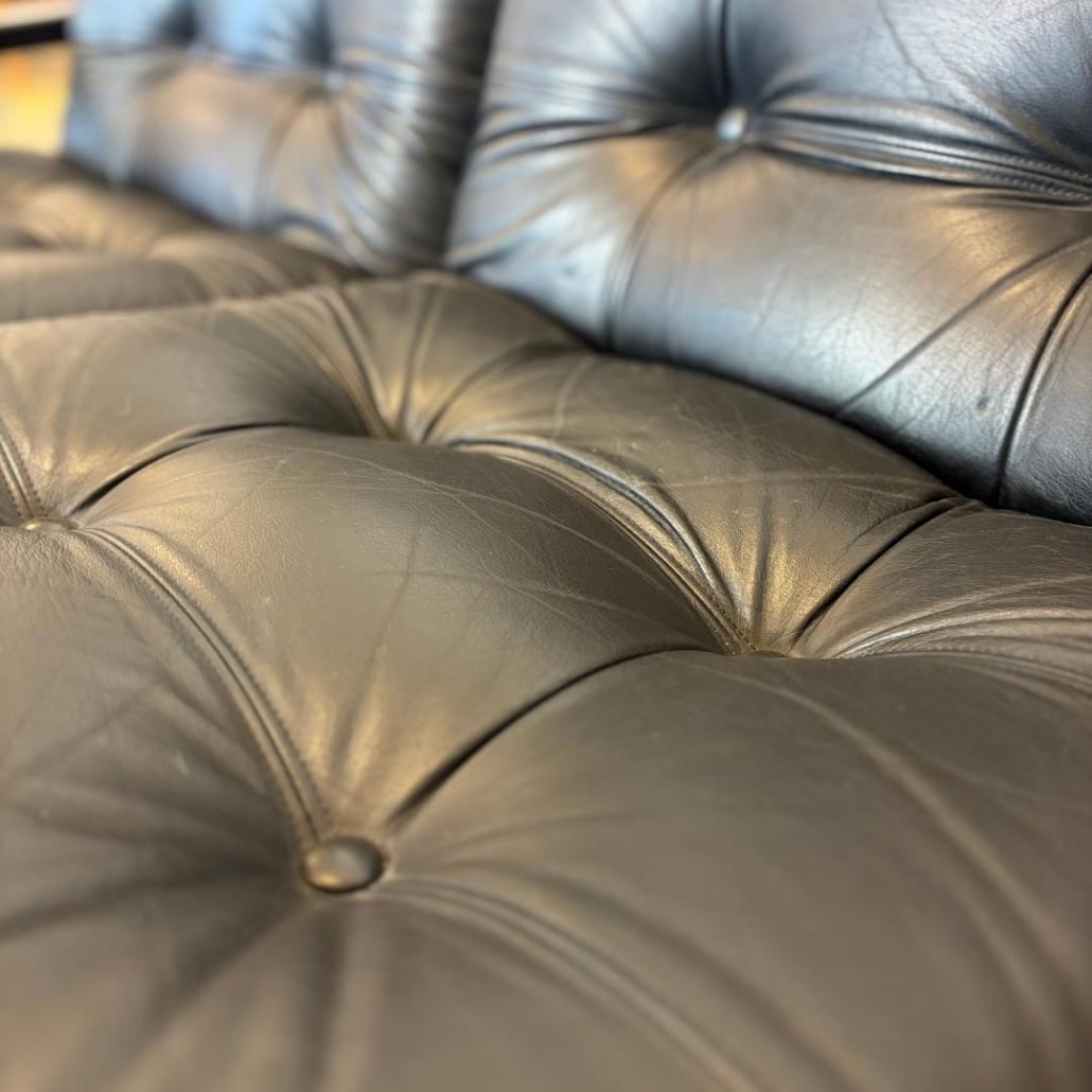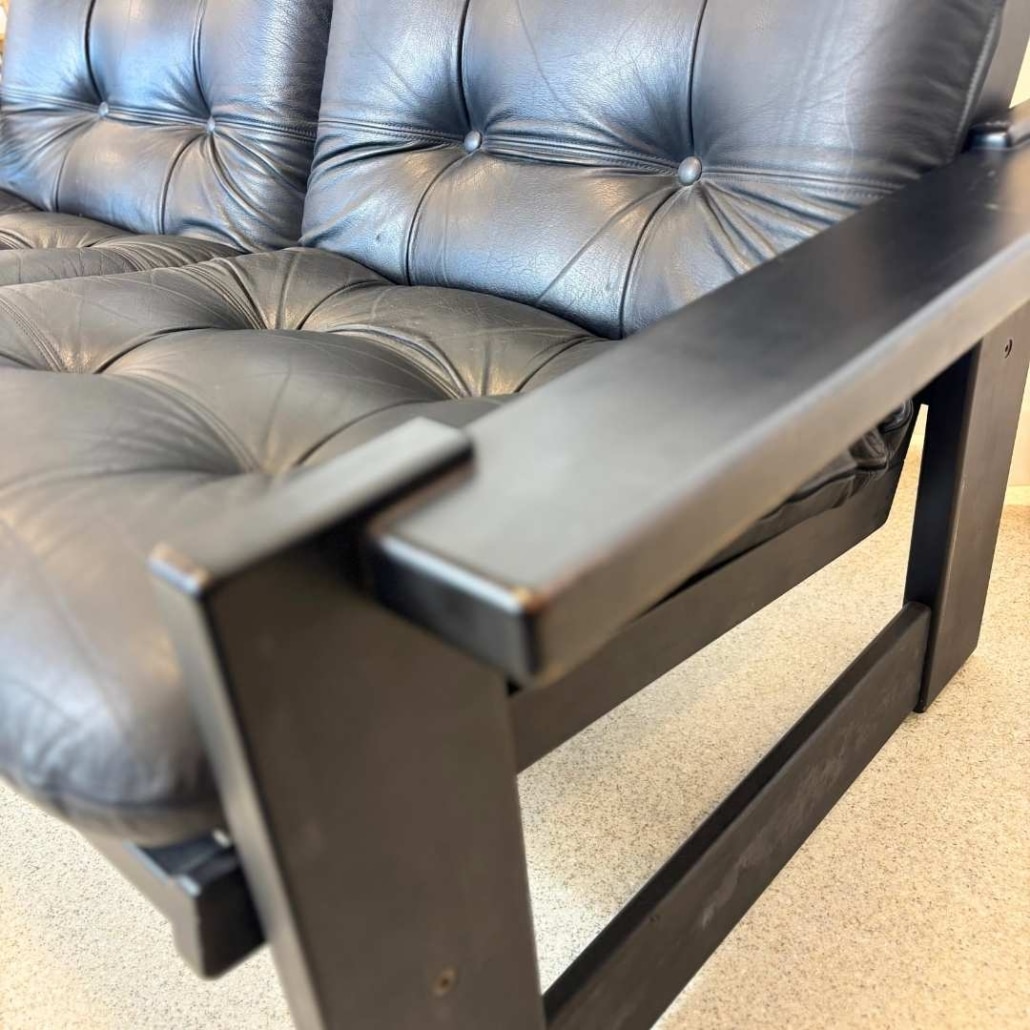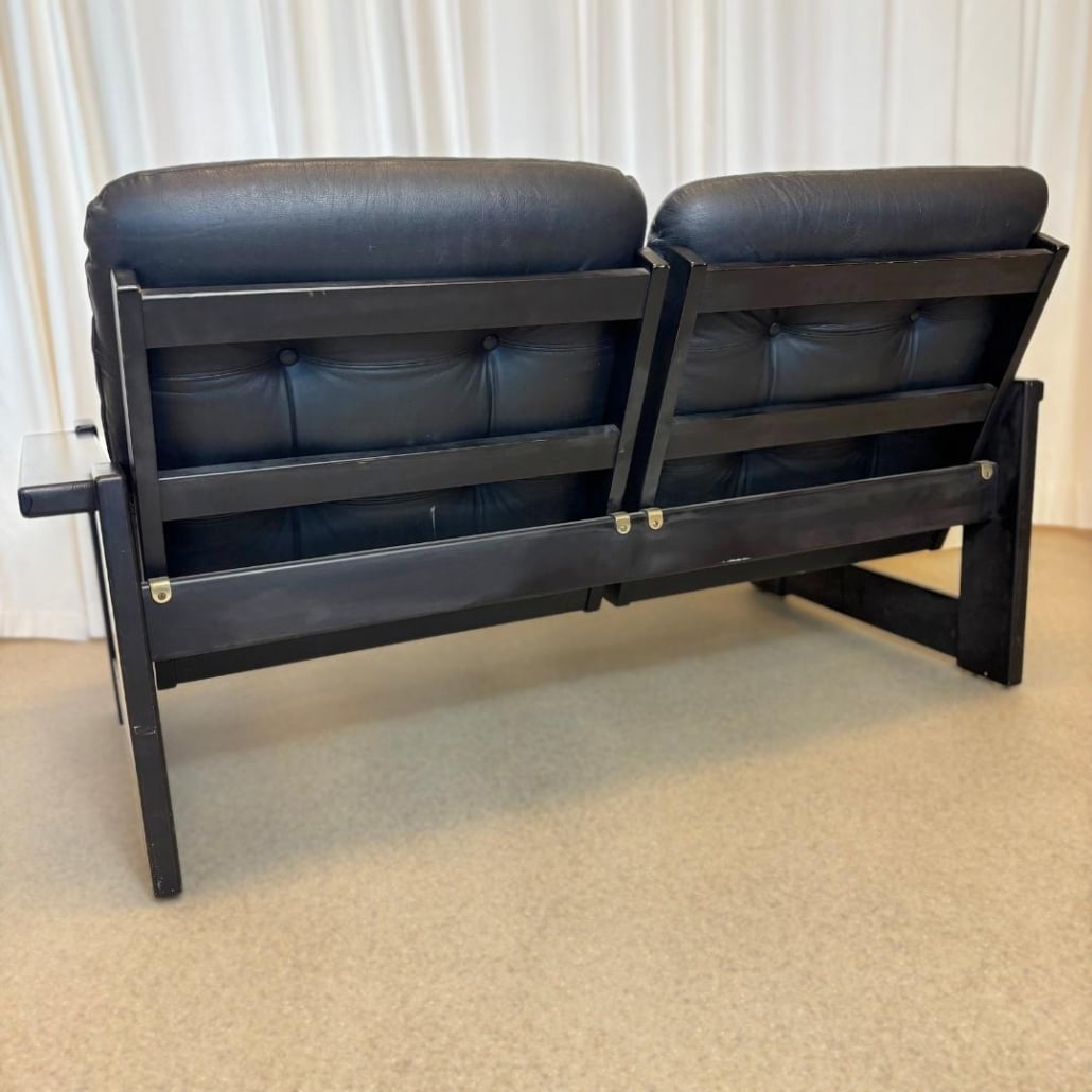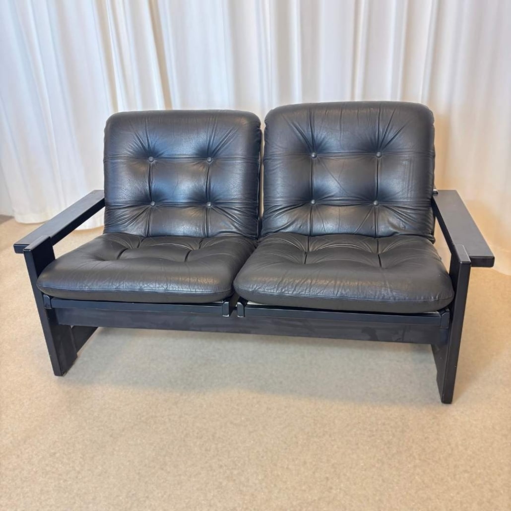 De zwarte leren bekleding is van hoge kwaliteit en verkeert in mooie vintage staat. Het leer voelt soepel aan en de bank is heerlijk comfortabel. Ideaal voor kleinere woonruimtes of als stijlvolle extra zitplek in een grotere kamer.