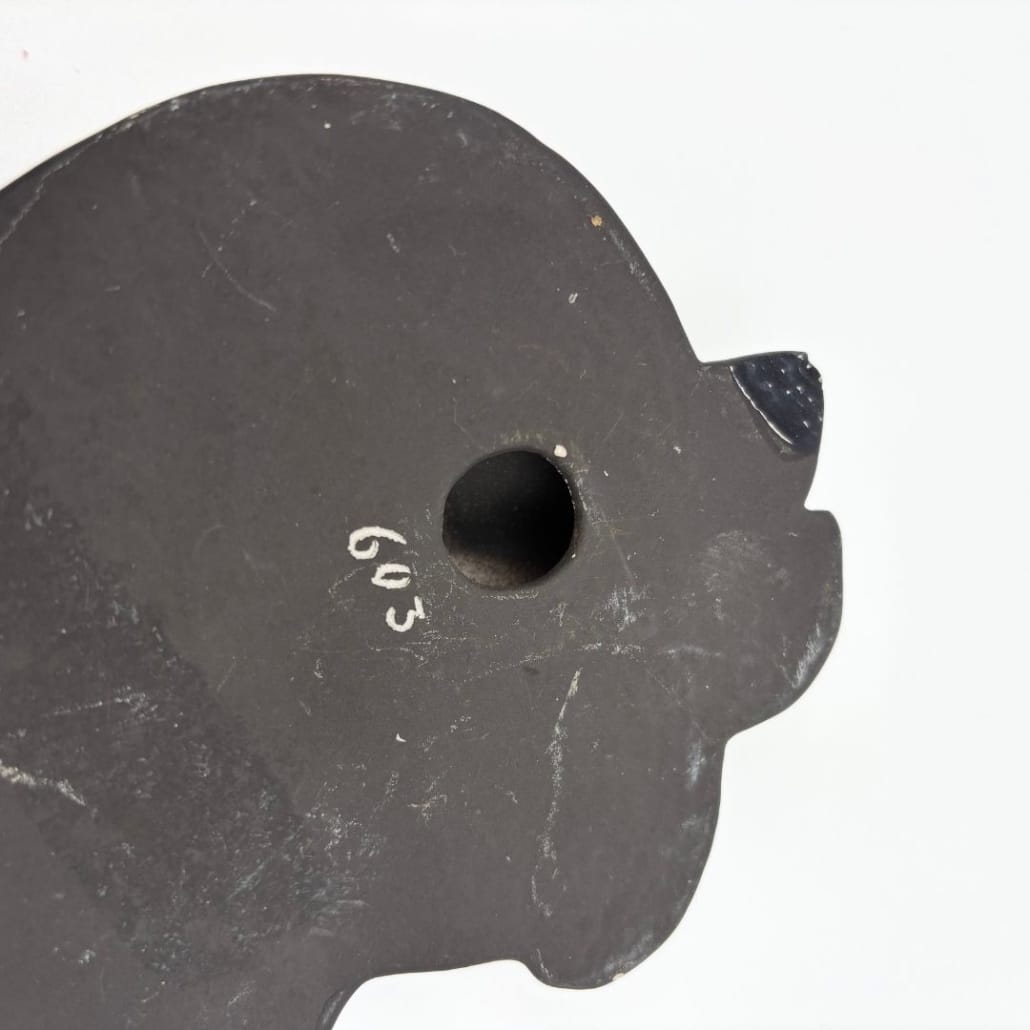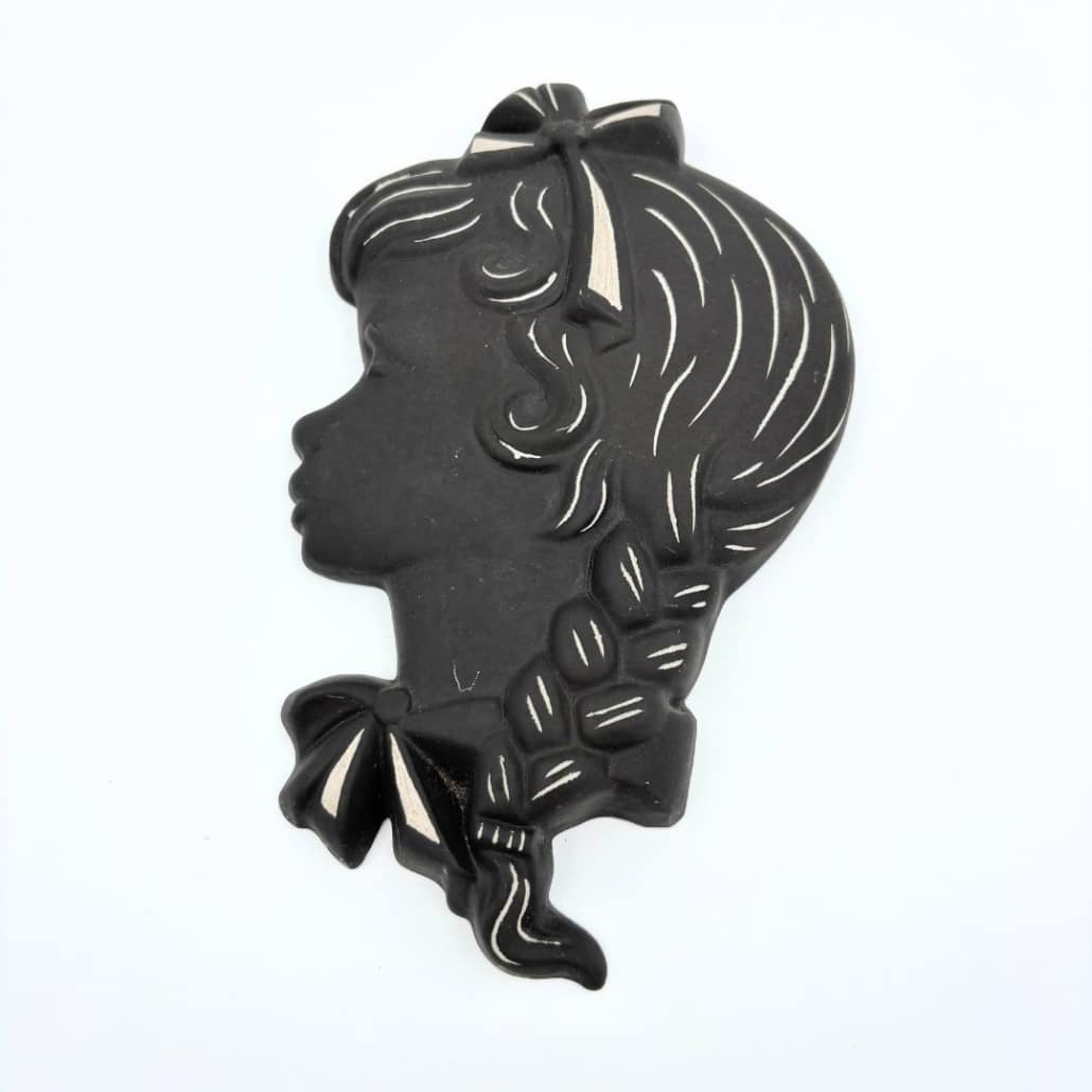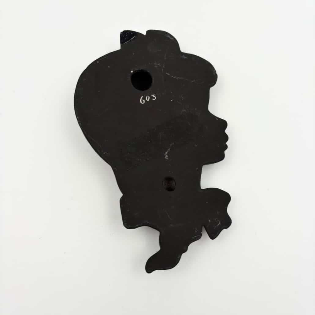Dit vintage wandhoofd van Kroon, model nummer 603, is een prachtig voorbeeld van Nederlandse keramiek uit de mid-century periode. Het silhouet toont een meisjesprofiel met gevlochten haar en strik, uitgevoerd in diep zwart met subtiele, met de hand aangebrachte lichte accenten.