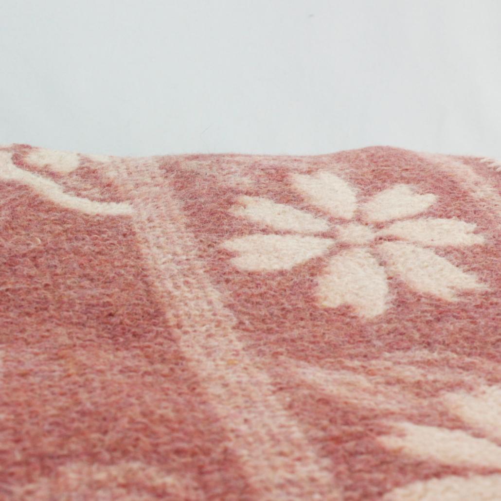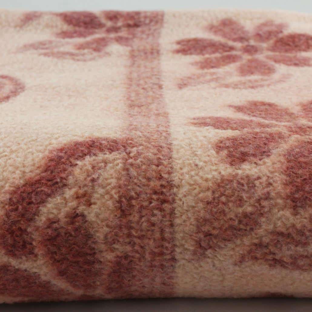 Fijne rozerode deken met bloemen in mooie strakke vormen. De achterkant is gespiegeld in kleur. Op de eerste foto zie je de kleuren het beste. Aan de vorm van de deken zie je dat hij al vaker gewassen is. Verder in goede vintage conditie.