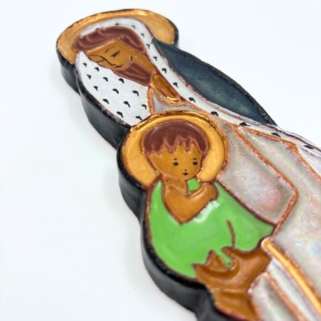 Deze bijzondere wandtegel van Perignem Amphora toont een gestileerde voorstelling van Maria met kind in prachtige glazuren. De moderne, sobere lijnen en het heldere kleurgebruik geven dit tafereel een serene en tijdloze uitstraling. De tegel van keramiek is met de hand gemaakt, wat dit exemplaar uniek maakt. Een Mid Century keramische creatie die heel mooi in het kerst interieur past.