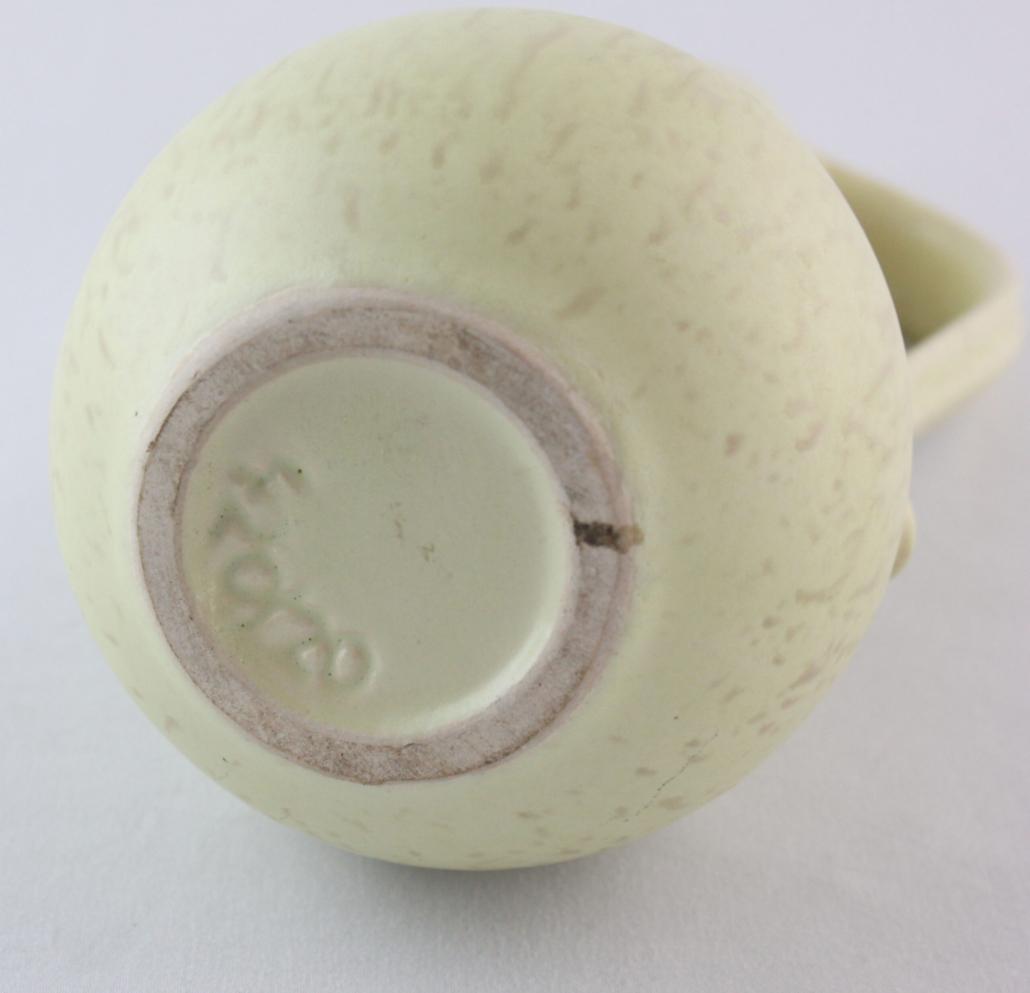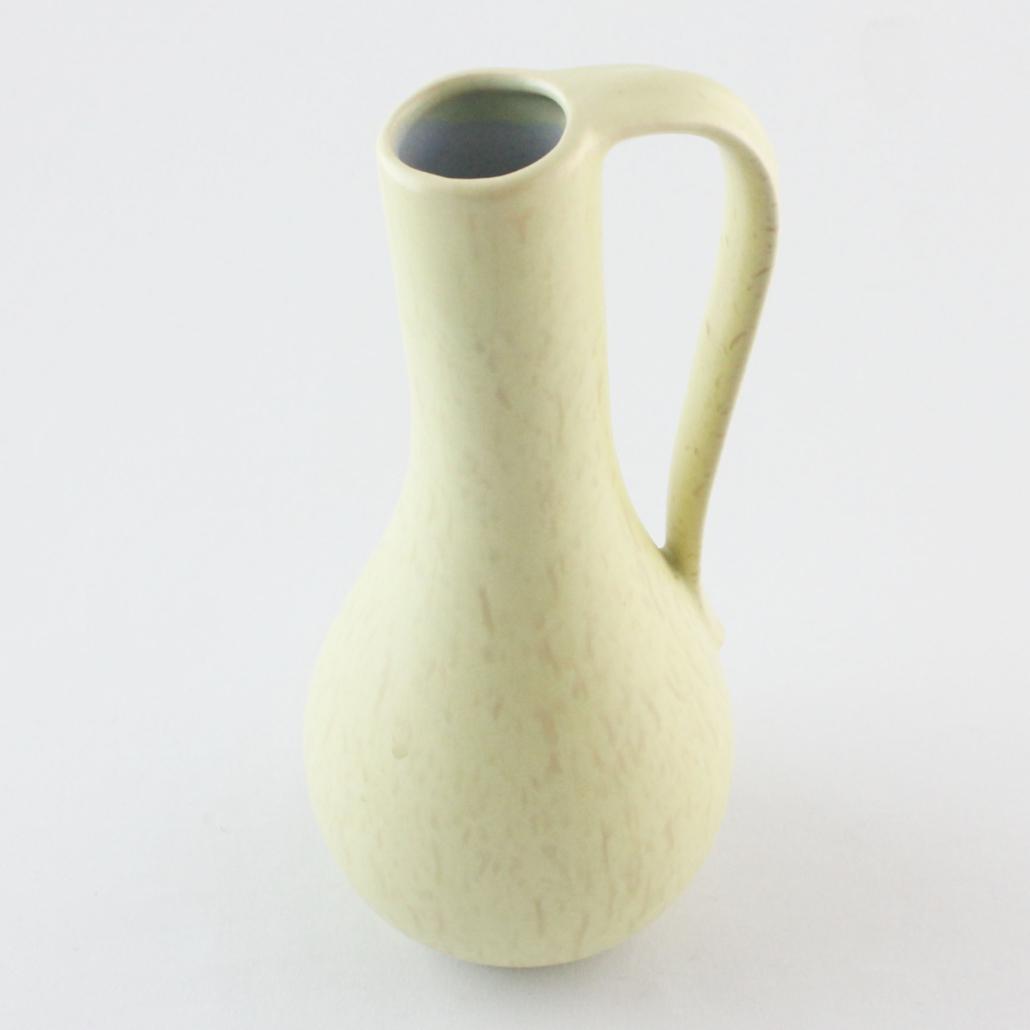 Prachtig West Germany vaasje in matte lichtgele tint met lichte spikkeltjes. Lichtblauwe glazuur aan de binnenkant. Hoogte: 21 cm.